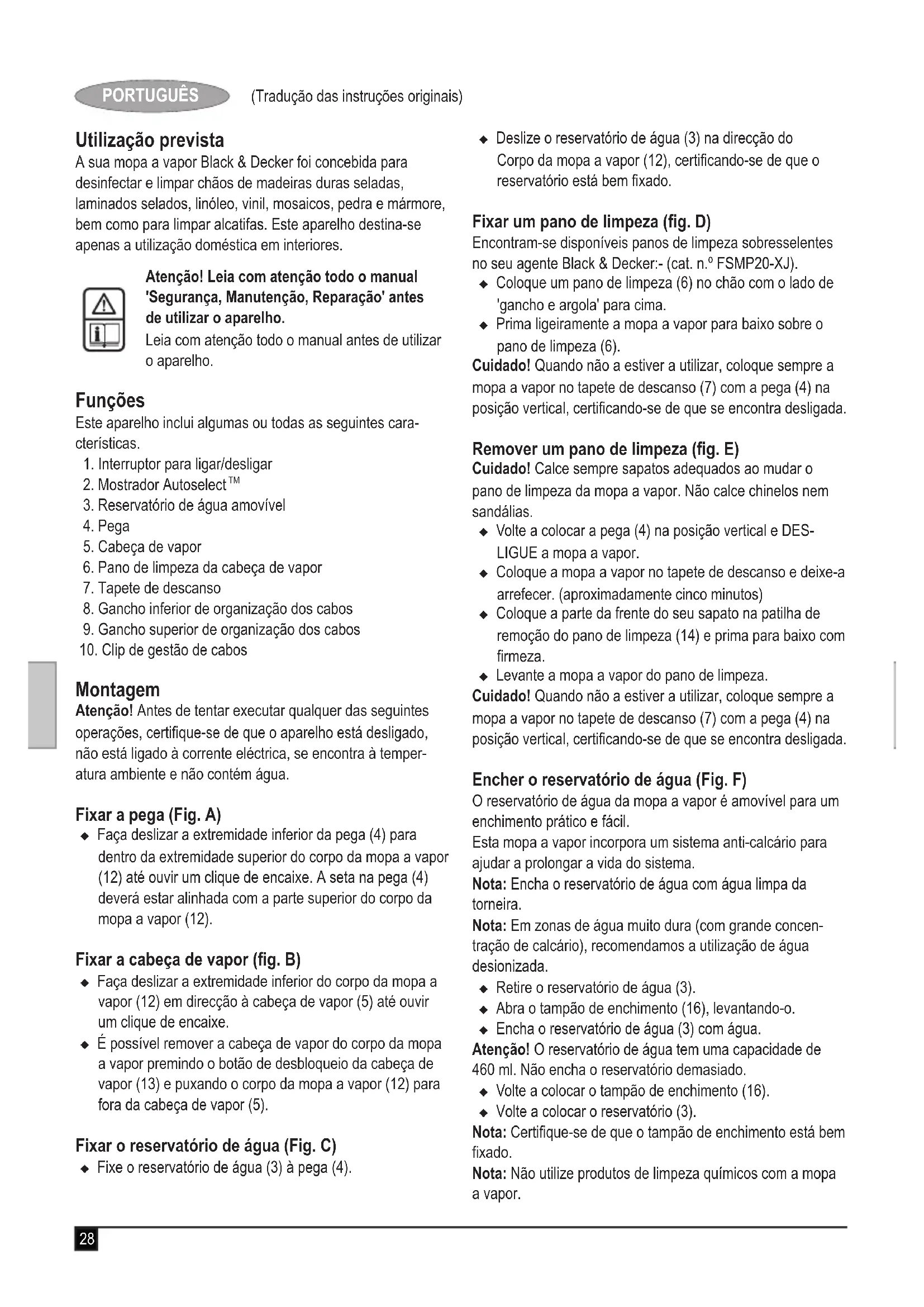 Consulte el capítulo de montaje del manual de usuario para las instrucciones de montaje correctas de todas las partes y accesorios. Dónde puedo obtener más información / accesorios para mi mopa de vapor. 13 www.blackanddecker.es/steammop28 (Tradução das instruções originais) PORTUGUÊS Utilização prevista A sua mopa a vapor Black & Decker foi concebida para desinfectar e limpar chãos de madeiras duras seladas, laminados selados, linóleo, vinil, mosaicos, pedra e mármore, bem como para limpar alcatifas. Este aparelho destina-se apenas a utilização doméstica em interiores. Atenção! Leia com atenção todo o manual 'Segurança, Manutenção, Reparação' antes de utilizar o aparelho. Leia com atenção todo o manual antes de utilizar o aparelho. Funções Este aparelho inclui algumas ou todas as seguintes cara- cterísticas.
