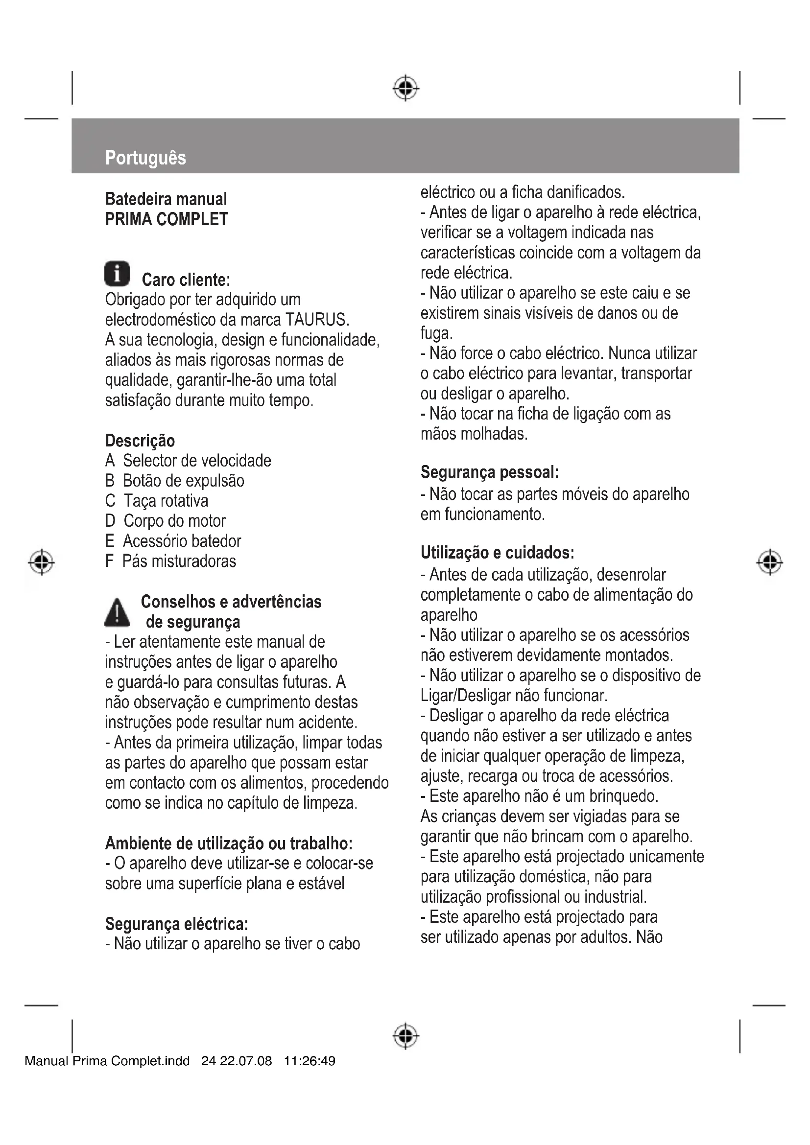 Encontre gratuitamente o manual do aparelho Prima Complet TAURUS em formato PDF.
