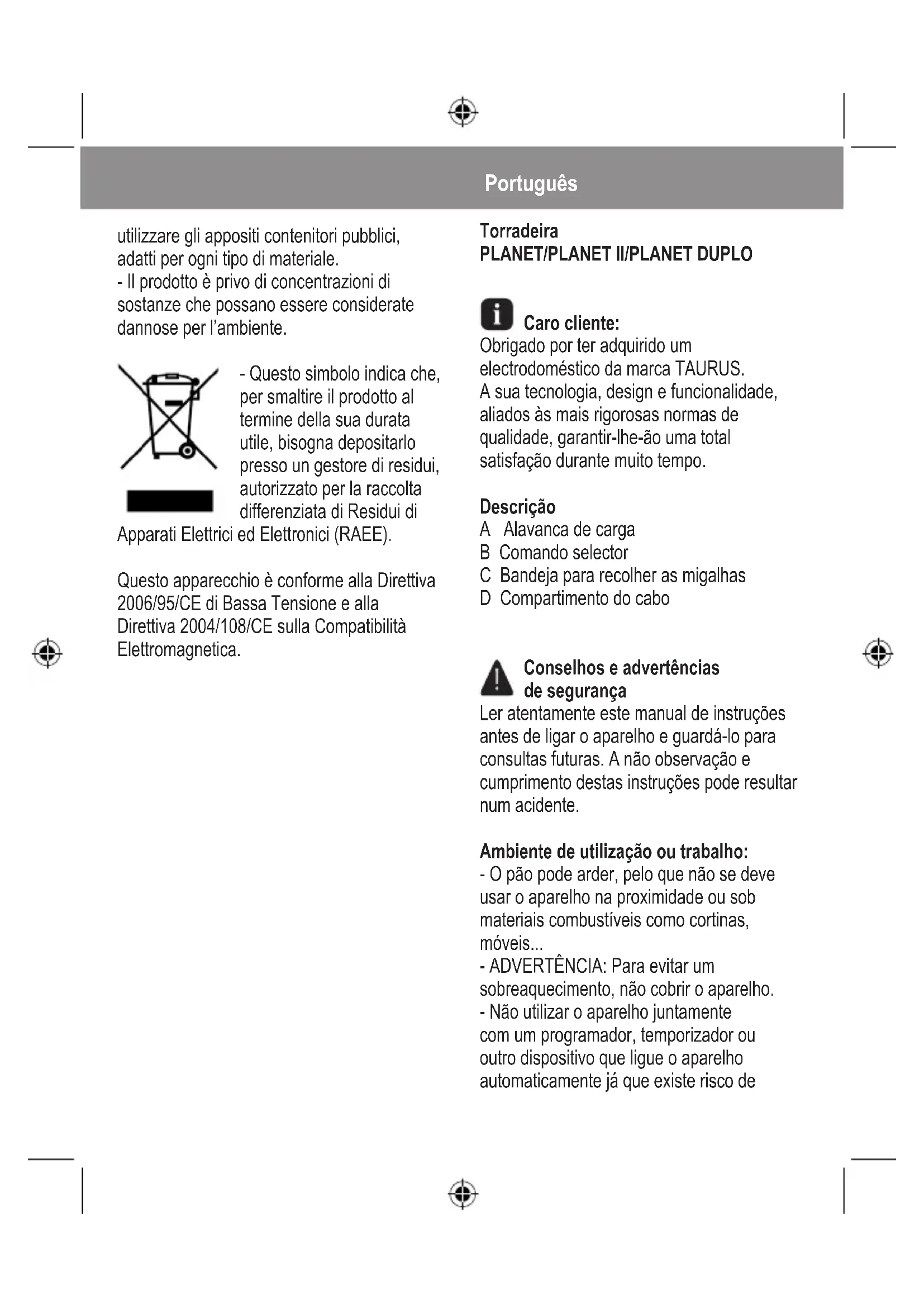Caro cliente: Obrigado por ter adquirido um electrodoméstico da marca TAURUS. A sua tecnologia, design e funcionalidade, aliados às mais rigorosas normas de qualidade, garantir-lhe-ão uma total satisfação durante muito tempo. Descrição A Alavanca de carga B Comando selector C Bandeja para recolher as migalhas D Compartimento do cabo Conselhos e advertências de segurança Ler atentamente este manual de instruções antes de ligar o aparelho e guardá-lo para consultas futuras. A não observação e cumprimento destas instruções pode resultar num acidente. Ambiente de utilização ou trabalho: - O pão pode arder, pelo que não se deve usar o aparelho na proximidade ou sob materiais combustíveis como cortinas, móveis... - ADVERTÊNCIA: Para evitar um sobreaquecimento, não cobrir o aparelho. - Não utilizar o aparelho juntamente com um programador, temporizador ou outro dispositivo que ligue o aparelho automaticamente já que existe risco deincêndio se o aparelho estiver coberto ou colocado incorrectamente. Segurança eléctrica: - Não utilizar o aparelho se tiver o cabo eléctrico ou a cha danicada. - Antes de ligar o aparelho à rede eléctrica, vericar se a voltagem indicada nas características coincide com a voltagem da rede eléctrica. - Ligar o aparelho a uma tomada de corrente com ligação a terra e que suporte, no mínimo, 10 amperes. - A cha do aparelho deve coincidir com a tomada de corrente eléctrica. Nunca modicar a cha eléctrica. Não utilizar adaptadores de cha eléctrica. - Não utilizar nem guardar o aparelho ao ar livre. - Não utilizar o aparelho se este caiu e se existirem sinais visíveis de danos ou de fuga. - Não forçar o cabo eléctrico. Nunca utilizar o cabo eléctrico para levantar, transportar ou desligar o aparelho. - Não enrolar o cabo no aparelho. - Não deixar que o cabo de alimentação entre em contacto com as superfícies quentes do aparelho. - Não tocar na cha de ligação com as mãos molhadas. Segurança pessoal: - A temperatura das superfícies acessíveis pode ser elevada quando o aparelho está em funcionamento. Utilização e cuidados: - Antes de cada utilização, desenrolar completamente o cabo de alimentação do aparelho. - Não utilizar o aparelho se o dispositivo de ligar/desligar não funcionar. - Não mover ou deslocar o aparelho enquanto estiver em funcionamento. - Não inverter o aparelho enquanto está em utilização ou ligado à rede eléctrica. - Desligar o aparelho da rede eléctrica quando não estiver a ser utilizado e antes de iniciar qualquer operação de limpeza. - Este aparelho está projectado unicamente para utilização doméstica, não para utilização prossional ou industrial. - Este aparelho está projectado para ser utilizado apenas por adultos. Não permitir que seja utilizado por pessoas não familiarizadas com este tipo de produto, pessoas incapacitadas ou crianças. - Guardar este aparelho fora do alcance de crianças e/ou pessoas incapacitadas. - Este aparelho não é um brinquedo. As crianças devem ser vigiadas para se garantir que não brincam com o aparelho. - Não guardar o aparelho se ainda estiver quente. - Qualquer utilização inadequada ou em desacordo com as instruções de utilização pode ser perigosa e anula a garantia e a responsabilidade do fabricante. Modo de emprego Notas prévias à utilização: - Antes de utilizar o produto pela primeira vez, é aconselhável utilizá-lo sem pão. Utilização: - Ligar o aparelho à rede eléctrica. - Introduzir a(s) fatia(s) de pão no aparelho.- Seleccionar o grau de torragem com o comando selector. - Ligar o aparelho deslizando o comando carregador para baixo, até escutar um “clique”. - A(s) fatia(s) de pão centrar-se-ão automaticamente, para uma torragem uniforme. - Para minimizar a produção de acrilamida durante o processo de tostagem, não deixar que o pão que castanho escuro ou preto. - Decorrido o tempo de torragem seleccionado, o aparelho desligar-se-á automaticamente. Função Cancelar: - Ao colocar o selector de torragem no posição “Stop” (paragem), detém-se o ciclo automáticamente e o pão é devolvido já torrado. O processo de tostagem pode ser interrumpido em qualquer momento, colocando o selector nesta Posição. Uma vez terminada a utilização do aparelho: - Desligar o aparelho da rede eléctrica. - Recolher o cabo e colocá-lo no seu compartimento. - Limpar o aparelho. Alojamento do Cabo - Este aparelho dispõe de um alojamento para o cabo de ligação à corrente, situado na parte inferior. Limpeza - Desligar o aparelho da rede eléctrica e deixá-lo arrefecer antes de iniciar qualquer operação de limpeza. - Limpar o aparelho com um pano húmido com algumas gotas de detergente e secá-lo de seguida. - Não utilizar solventes, produtos com um factor pH ácido ou básico como a lixívia nem produtos abrasivos na limpeza do aparelho. - Nunca submergir o aparelho em água ou em qualquer outro líquido, nem o colocar debaixo da torneira. - Recomenda-se limpar o aparelho regularmente e retirar todos os restos de alimentos. Bandeja de recolha de migalhas: - O aparelho dispõe de uma bandeja que permite recolher as migalhas de pão que possam car no interior do aparelho. - Extrair a bandeja do aparelho - Despejar o conteúdo da bandeja. - Sacudir ligeiramente o aparelho para eliminar outros restos de pão do interior. - Tornar a colocar a bandeja no aparelho. Anomalias e reparação - Em caso de avaria, levar o aparelho a um Serviço de Assistência Técnica autorizado. Não o tentar desmontar ou reparar, já que pode ser perigoso. - Se a ligação de rede estiver danicada, deve ser substituída e deve agir-se como em caso de avaria. Ecologia e reciclabilidade do produto - Os materiais que constituem a embalagem deste aparelho estão integrados num sistemade recolha, classicação e reciclagem. Se desejar desfazer-se deles, pode utilizar os contentores públicos apropriados para cada tipo de material. - O p