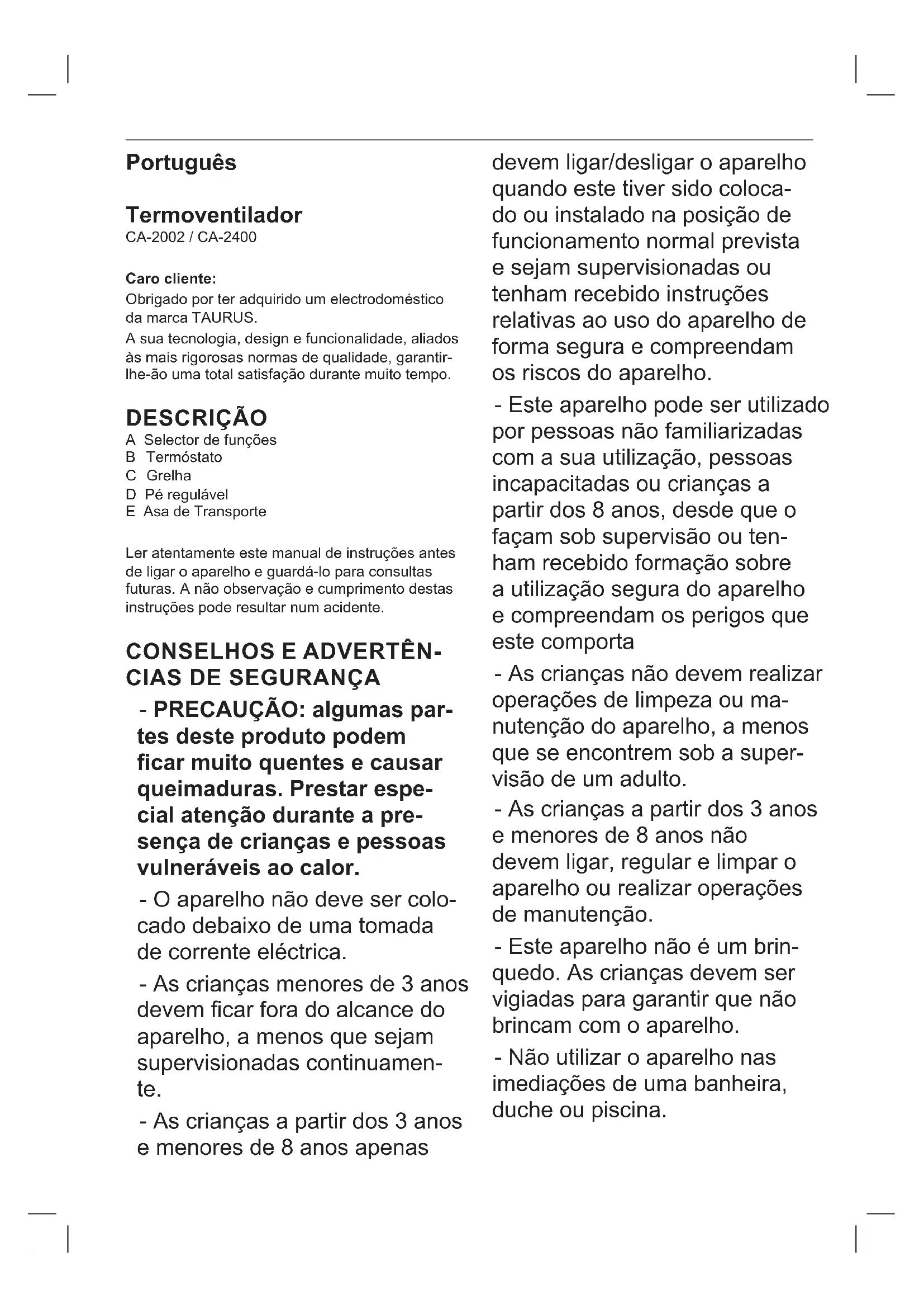 0 kW Tipo de potência caloríca, apenas para os aquecedores de ambiente local elétricos de acumu- lação Comando manual da carga térmica, com termóstato integrado Não Comando manual da carga térmica, com retroação da temperatura interior e/ou exterior Não Comando eletrónico da carga térmica, com retroação da temperatura interior e/ou exterior Não Potênciacalorícacomventilador Não Tipo de controlo da potência caloríca/da temperatura interior Potênciacalorícadeumsónível,semcontrolodatemperaturainterior Não Dois ou mais níveis manuais, sem controlo da temperatura interior Não Com controlo da temperatura interior mediante um termóstato mecânico Sim Com controlo eletrónico da temperatura interior Não Controlo eletrónico da temperatura interior e temporizador diário Não Controlo eletrónico da temperatura interior e temporizador semanal Não Outras opções de controlo Controlo da temperatura interior com deteção de presença Não Controlo da temperatura interior com deteção de janelas abertas Não Com opção de controlo remoto Não Com controlo de ligação adaptável Não Com limitação do tempo de funcionamento Não Com sensor de lâmpada negra Não Dados de contacto "ELECTRODOMÉSTICOS TAURUS, S.L. Avda. Barcelona S/N 25790 Oliana, Lleida, Spain”Català Termoventilador CA-2002 / CA-2400 Distingit client: Liagraïmques‘hagideciditperlacomprad‘un producte de la marca TAURUS. La seva tecnologia, disseny i funcionalitat, juntament amb el fet de superar les més estrictes normes de qualitat li comportaran total satisfacció durant molt de temps. DESCRIPCIÓ A Selector de funció B Termòstat C Reixeta D Peu regulable E Ansa de transport Llegiratentamentaquestfulletd‘instruccionsab- ansdeposarl‘aparellenmarxaiguardar-lopera posteriors consultes. La no observació i compli- mentd‘aquestesinstruccionspodencomportar com a resultat un accident.