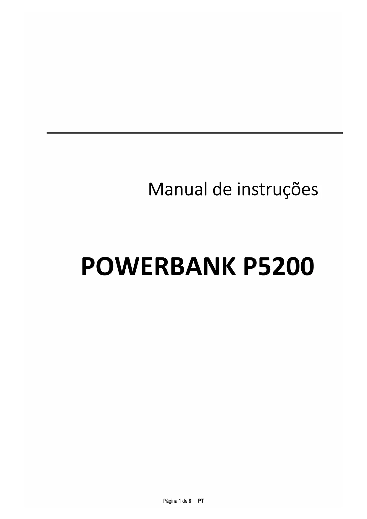 POWERBANK P5200Página 2 de 8 PT Sobre este manual: Leia atentamente este manual e observe, leia e siga todas as instruções mencionadas no mesmo, por forma a garantir uma vida longa e uma utilização fiável do dispositivo. Queira manter este manual num local acessível para consulta futura e passá-lo aos outros utilizadores do dispositivo. Uso correto Este Powerbank deve ser utilizado exclusivamente para abastecer energía a dispositivos com uma tensão de serviço de 5 V de corrente contínua (telemóveis, leitores MP3, etc.). Qualquer outro uso é considerado incorreto e pode causar danos e lesões. Fica excluído qualquer tipo de reclamação por danos resultantes do uso inapropriado. Para evitar disfunções, não conete o componente de início da USB às ligações USB dos computadores de outros dispositivos. Eles só são idealizados para carregar dispositivos. Não desmonte o dispositivo nas suas peças individuais e não experimente repará-lo. Não contém peças reparáveis pelo utilizador e, nesse caso, a garantia será anulada. Não introduza objetos que não foram concebidos para serem usados nas entradas do produto. Existe o perigo de curto-circuito. Não manuseie este dispositivo com mãos molhadas. Não use água ou substâncias químicas para limpar o dispositivo. Use apenas um pano seco. É normal o dispositivo produzir calor ao ser usado. Não cubra o produto ao ser usado. Não use o dispositivo se existirem danos visíveis ou se estiver molhado. Instruções de segurança: Condições de serviço: Utilize o dispositivo a uma temperatura de entre 0º e 40 graus Celsius com uma humidade relativa máxima de 90%. Se não for usar o Powerbank durante algum tempo, guarde-o a uma temperatura de entre -10 e 40 e uma humidade relativa máxima de 90% (durante pouco tempo) e carregue-o a cada três meses para obter o máximo rendimento.Página 3 de 8 PT Não utilize o aparelho em zonas extremamente frias, quentes, húmidas ou cheias de pó. Evite também a exposição directa ao sol. Proteja el producto contra el fuego o lhamas. Risco de explosão!