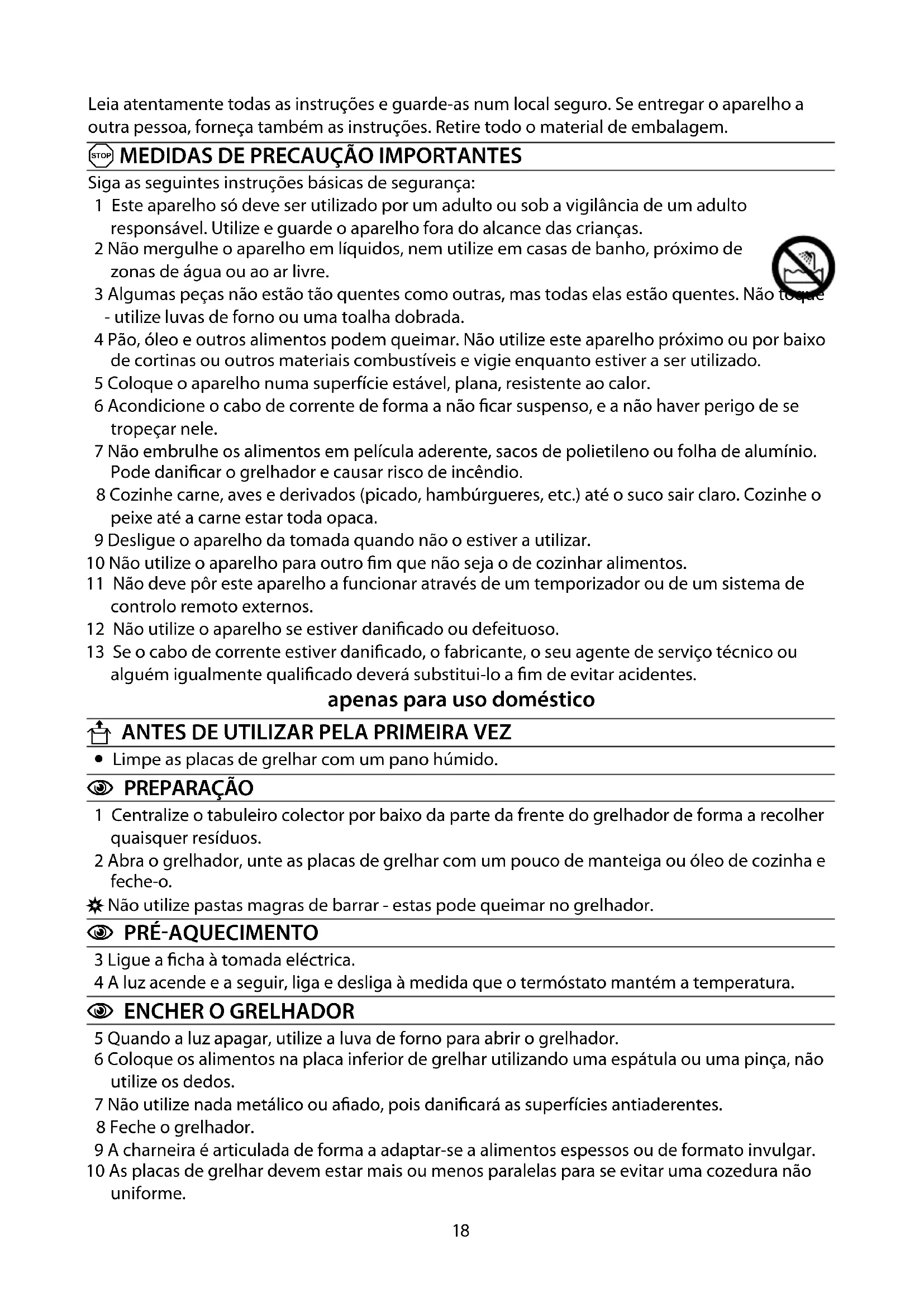 6 Coloque os alimentos na placa inferior de grelhar utilizando uma espátula ou uma pinça, não utilize os dedos.