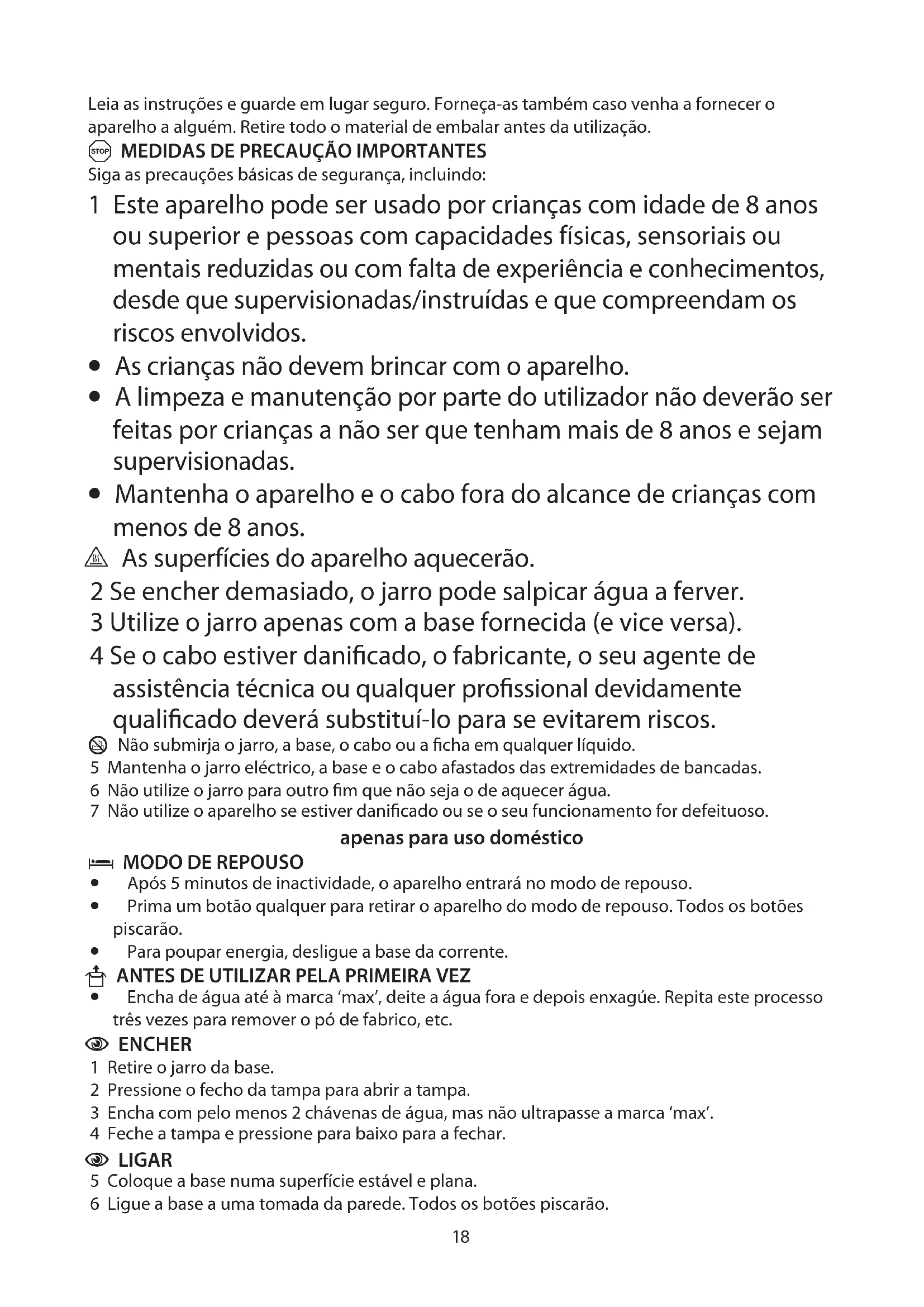 - Mantenha o aparelho e o cabo fora do alcance de crianças com menos de 8 anos. ¬ As superfícies do aparelho aquecerão. 2 Se encher demasiado, o jarro pode salpicar água a ferver. 3 Utilize o jarro apenas com a base fornecida (e vice versa). 4 Se o cabo estiver danificado, o fabricante, o seu agente de assistência técnica ou qualquer profissional devidamente qualificado deverá substituí-lo para se evitarem riscos. H Não submirja o jarro, a base, o cabo ou a ficha em qualquer líquido. 5 Mantenha o jarro eléctrico, a base e o cabo afastados das extremidades de bancadas. 6 Não utilize o jarro para outro fim que não seja o de aquecer água. 7 Não utilize o aparelho se estiver danificado ou se o seu funcionamento for defeituoso. apenas para uso doméstico