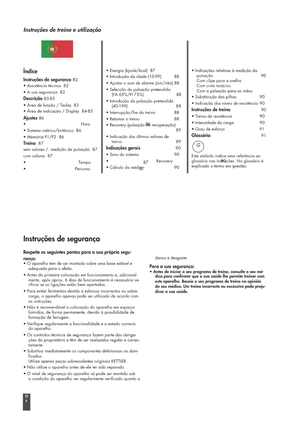 - Hora 86• Sistema métrico/britânico 86• Memória P1/P2 86 Treino 87 sem valores / medição da pulsação 87com valores 87• Tempo 87• Percurso 87• Energia (kjoule/kcal) 87• Introdução da idade (10-99) 88• Ajustar o som de alarme (sim/não) 88• Selecção da pulsação pretendida (FA 65%/FI 75%) 88• Introdução da pulsação pretendida (40-199) 88• Interrupção/fim do treino 88• Retomar o treino 88• Recovery (pulsação de recuperação)