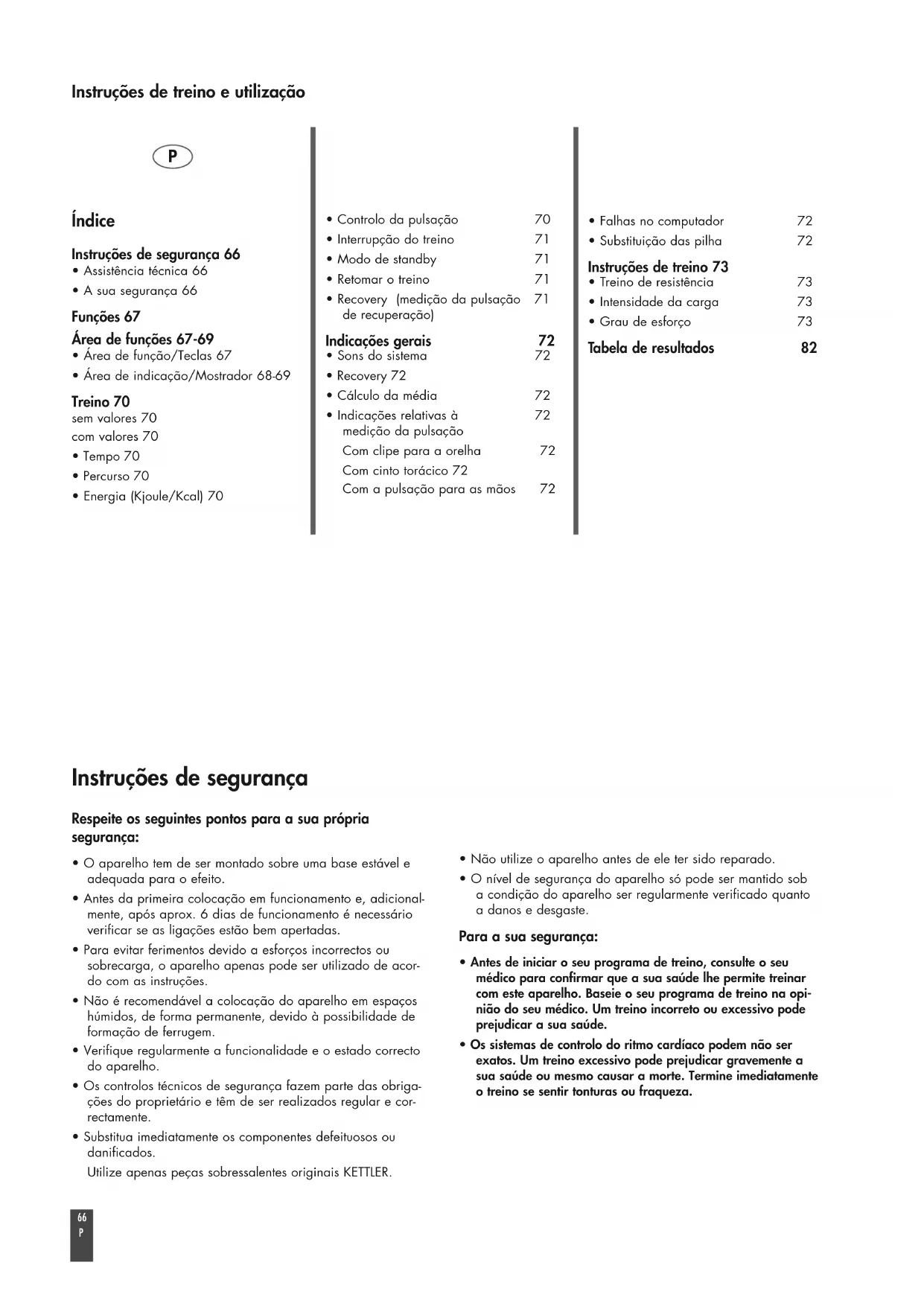 - Os sistemas de controlo do ritmo cardíaco podem não ser exatos. Um treino excessivo pode prejudicar gravemente a sua saúde ou mesmo causar a morte. Termine imediatamente o treino se sentir tonturas ou fraqueza. Índice Instruções de segurança 66