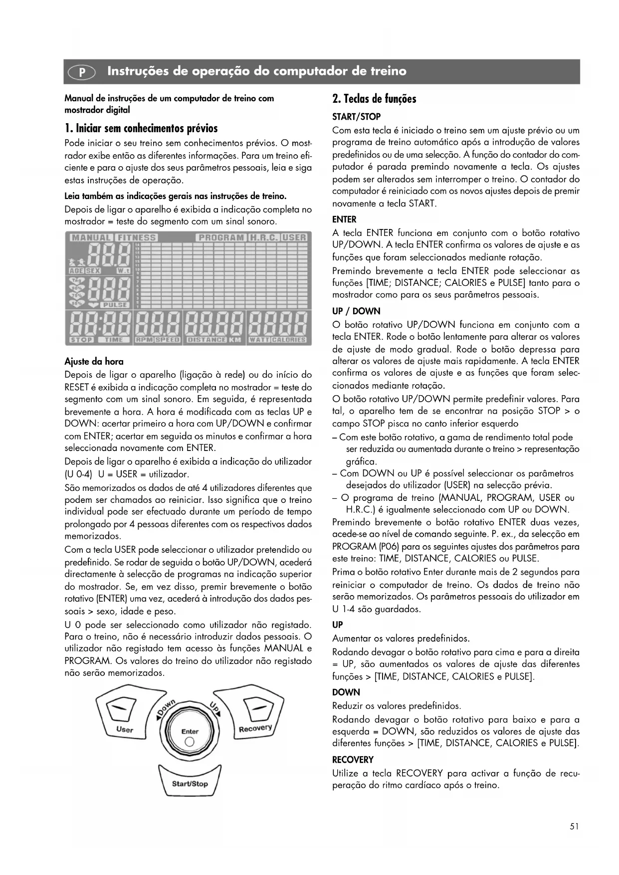 Aumentar os valores predefinidos. Rodando devagar o botão rotativo para cima e para a direita = UP, são aumentados os valores de ajuste das diferentes funções > [TIME, DISTANCE, CALORIES e PULSE]. DOWN Reduzir os valores predefinidos. Rodando devagar o botão rotativo para baixo e para a esquerda = DOWN, são reduzidos os valores de ajuste das diferentes funções > [TIME, DISTANCE, CALORIES e PULSE]. RECOVERY Utilize a tecla RECOVERY para activar a função de recu- peração do ritmo cardíaco após o treino. Instruções de operação do computador de treino P52 Instruções de operação do computador de treino