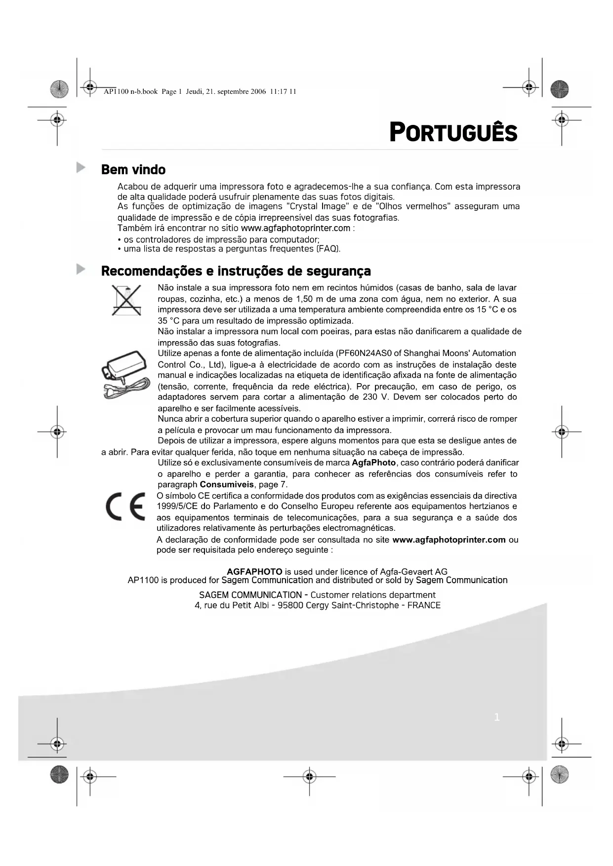 - uma lista de respostas a perguntas frequentes (FAQ). Recomendações e instruções de segurança Não instale a sua impressora foto nem em recintos húmidos (casas de banho, sala de lavar roupas, cozinha, etc.) a menos de 1,50 m de uma zona com água, nem no exterior. A sua impressora deve ser utilizada a uma temperatura ambiente compreendida entre os 15 °C e os 35 °C para um resultado de impressão optimizada. Não instalar a impressora num local com poeiras, para estas não danificarem a qualidade de impressão das suas fotografias. Utilize apenas a fonte de alimentação incluída (PF60N24AS0 of Shanghai Moons' Automation Control Co., Ltd), ligue-a à electricidade de acordo com as instruções de instalação deste manual e indicações localizadas na etiqueta de identificação afixada na fonte de alimentação (tensão, corrente, frequência da rede eléctrica). Por precaução, em caso de perigo, os adaptadores servem para cortar a alimentação de 230 V. Devem ser colocados perto do aparelho e ser facilmente acessíveis. Nunca abrir a cobertura superior quando o aparelho estiver a imprimir, correrá risco de romper a película e provocar um mau funcionamento da impressora. Depois de utilizar a impressora, espere alguns momentos para que esta se desligue antes de a abrir. Para evitar qualquer ferida, não toque em nenhuma situação na cabeça de impressão. Utilize só e exclusivamente consumíveis de marca AgfaPhoto, caso contrário poderá danificar o aparelho e perder a garantia, para conhecer as referências dos consumíveis refer to paragraph Consumiveis, page 7. O símbolo CE certifica a conformidade dos produtos com as exigências essenciais da directiva 1999/5/CE do Parlamento e do Conselho Europeu referente aos equipamentos hertzianos e aos equipamentos terminais de telecomunicações, para a sua segurança e a saúde dos utilizadores relativamente às perturbações electromagnéticas. A declaração de conformidade pode ser consultada no site www.agfaphotoprinter.com ou pode ser requisitada pelo endereço seguinte : AGFAPHOTO is used under licence of Agfa-Gevaert AG AP1100 is produced for Sagem Communication and distributed or sold by Sagem Communication SAGEM COMMUNICATION - Customer relations department 4, rue du Petit Albi - 95800 Cergy Saint-Christophe - FRANCE AP1100 n-b.book Page 1 Jeudi, 21. septembre 2006 11:17 112 Ambiente A preservação do ambiente é uma preocupação essencial da AgfaPhoto. O Grupo AgfaPhoto tem a vontade de explorar as instalações que respeitem o ambiente e escolheu integrar o desempenho ambiental no conjunto do ciclo de vida dos seus produtos, da fase de fabrico à colocação em serviço, utilização e eliminação. A EMBALAGEM A presença do logótipo (ponto verde) significa que é feita uma contribuição a um organismo nacional certificado, para melhorar as infra-estruturas de recuperação e reciclagem das embalagens. Para facilitar esta reciclagem, queira respeitar as regras de triagem feitas localmente para este tipo de detritos.