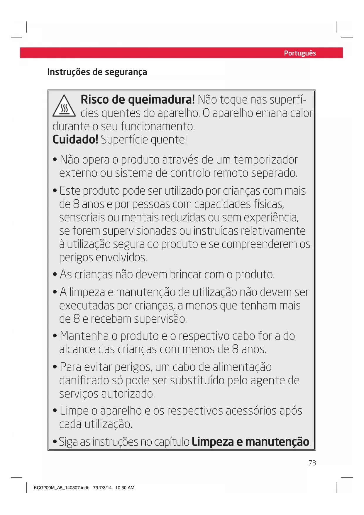 Nunca toque nas superficies quentes do aparelho durante o seu functiOnamento ou imeditamente antes a sua utilização. Para Abrir o aparelho, toque apenas na pega.