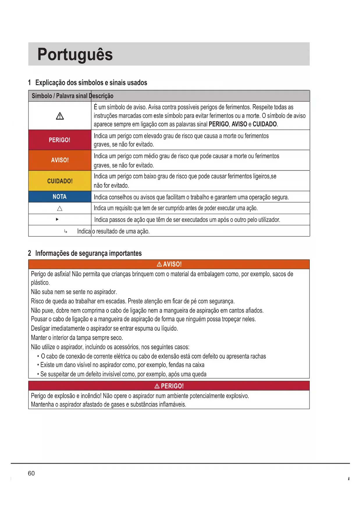 - Se suspeitar de um defeito invisível como, por exemplo, após uma queda l PERIGO! Perigo de explosão e incêndio! Não opere o aspirador num ambiente potencialmente explosivo. Mantenha o aspirador afastado de gases e substâncias inamáveis.61 l PERIGO! Perigo de explosão e incêndio! Não utilize o aspirador para aspirar o seguinte: