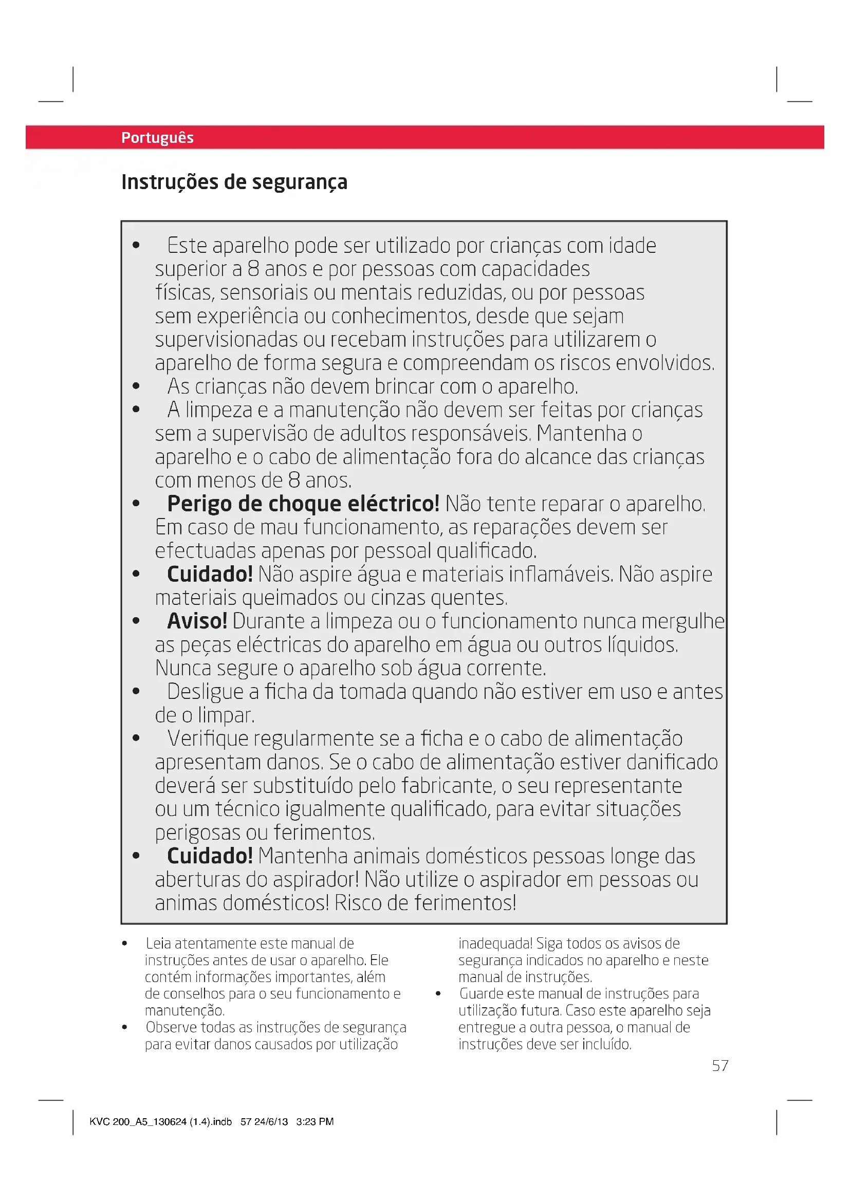 - Guardeestemanualdeinstruçõespara utilizaçãofutura.Casoesteaparelhoseja entregueaoutrapessoa,omanualde instruçõesdeveserincluído. KVC 200_A5_130624 (1.4).indb 57 24/6/13 3:23 PM58 Português Português Instruções de segurança