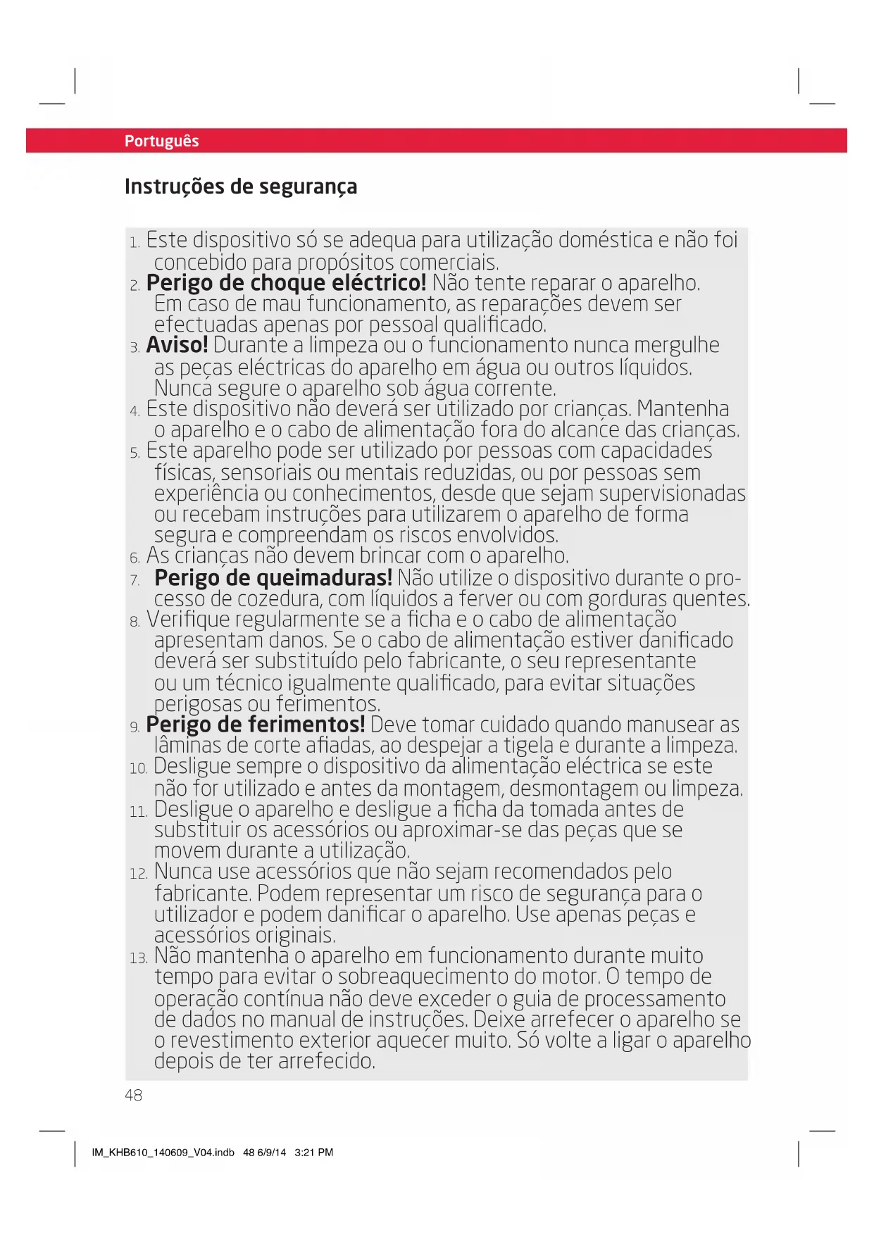 tempo para evitar o sobreaquecimento do motor. O tempo de operação contínua não deve exceder o guia de processamento de dados no manual de instruções. Deixe arrefecer o aparelho se o revestimento exterior aquecer muito. Só volte a ligar o aparelho depois de ter arrefecido. IM_KHB610_140609_V04.indb 48 6/9/14 3:21 PM49 Português Instruções de segurança