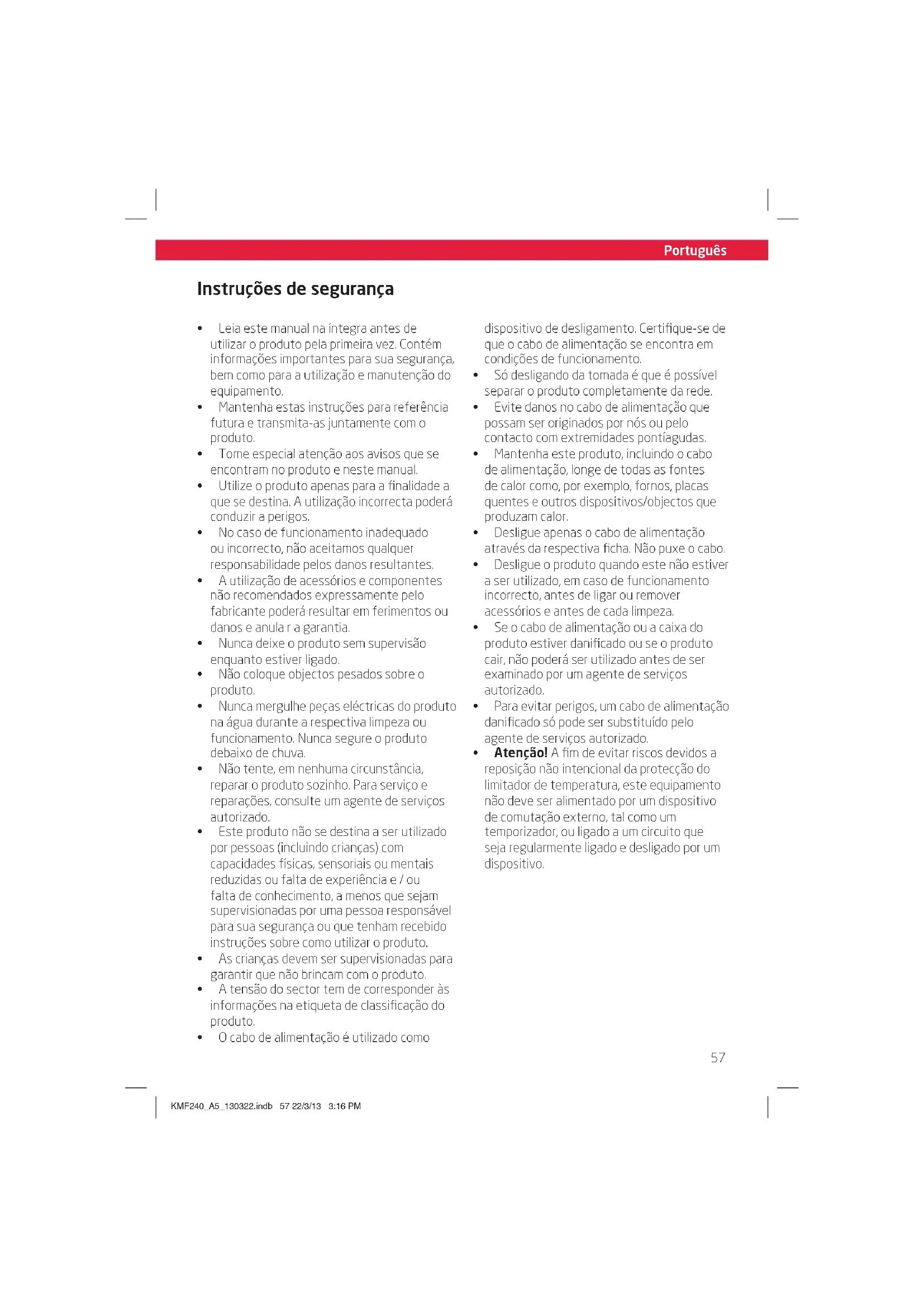 Instruções de segurança Œ Leia este manual na íntegra antes de utilizar o produto pela primeira vez. Contém informações importantes para sua segurança, bem como para a utilização e manutenção do equipamento. Œ Mantenha estas instruções para referência futura e transmita-as juntamente com o produto. Œ Tome especial atenção aos avisos que se encontram no produto e neste manual. Œ Utilize o produto apenas para a finalidade a que se destina. A utilização incorrecta poderá conduzir a perigos. Œ No caso de funcionamento inadequado ou incorrecto, não aceitamos qualquer responsabilidade pelos danos resultantes. Œ A utilização de acessórios e componentes não recomendados expressamente pelo fabricante poderá resultar em ferimentos ou danos e anula r a garantia. Œ Nunca deixe o produto sem supervisão enquanto estiver ligado. Œ Não coloque objectos pesados sobre o produto. Œ Nunca mergulhe peças eléctricas do produto na água durante a respectiva limpeza ou funcionamento. Nunca segure o produto debaixo de chuva. Œ Não tente, em nenhuma circunstância, reparar o produto sozinho. Para serviço e reparações, consulte um agente de serviços autorizado. Œ Este produto não se destina a ser utilizado por pessoas (incluindo crianças) com capacidades físicas, sensoriais ou mentais reduzidas ou falta de experiência e / ou falta de conhecimento, a menos que sejam supervisionadas por uma pessoa responsável para sua segurança ou que tenham recebido instruções sobre como utilizar o produto. Œ As crianças devem ser supervisionadas para garantir que não brincam com o produto. Œ A tensão do sector tem de corresponder às informações na etiqueta de classificação do produto. Œ O cabo de alimentação é utilizado como dispositivo de desligamento. Certifique-se de que o cabo de alimentação se encontra em condições de funcionamento. Œ Só desligando da tomada é que é possível separar o produto completamente da rede. Œ Evite danos no cabo de alimentação que possam ser originados por nós ou pelo contacto com extremidades pontíagudas. Œ Mantenha este produto, incluindo o cabo de alimentação, longe de todas as fontes de calor como, por exemplo, fornos, placas quentes e outros dispositivos/objectos que produzam calor. Œ Desligue apenas o cabo de alimentação através da respectiva ficha. Não puxe o cabo. Œ Desligue o produto quando este não estiver a ser utilizado, em caso de funcionamento incorrecto, antes de ligar ou remover acessórios e antes de cada limpeza. Œ Se o cabo de alimentação ou a caixa do produto estiver danificado ou se o produto cair, não poderá ser utilizado antes de ser examinado por um agente de serviços autorizado. Œ Para evitar perigos, um cabo de alimentação danificado só pode ser substituído pelo agente de serviços autorizado. Œ Atenção! A fim de evitar riscos devidos a reposição não intencional da protecção do limitador de temperatura, este equipamento não deve ser alimentado por um dispositivo de comutação externo, tal como um temporizador, ou ligado a um circuito que seja regularmente ligado e desligado por um dispositivo. KMF240_A5_130322.indb 57 22/3/13 3:16 PMPortuguês