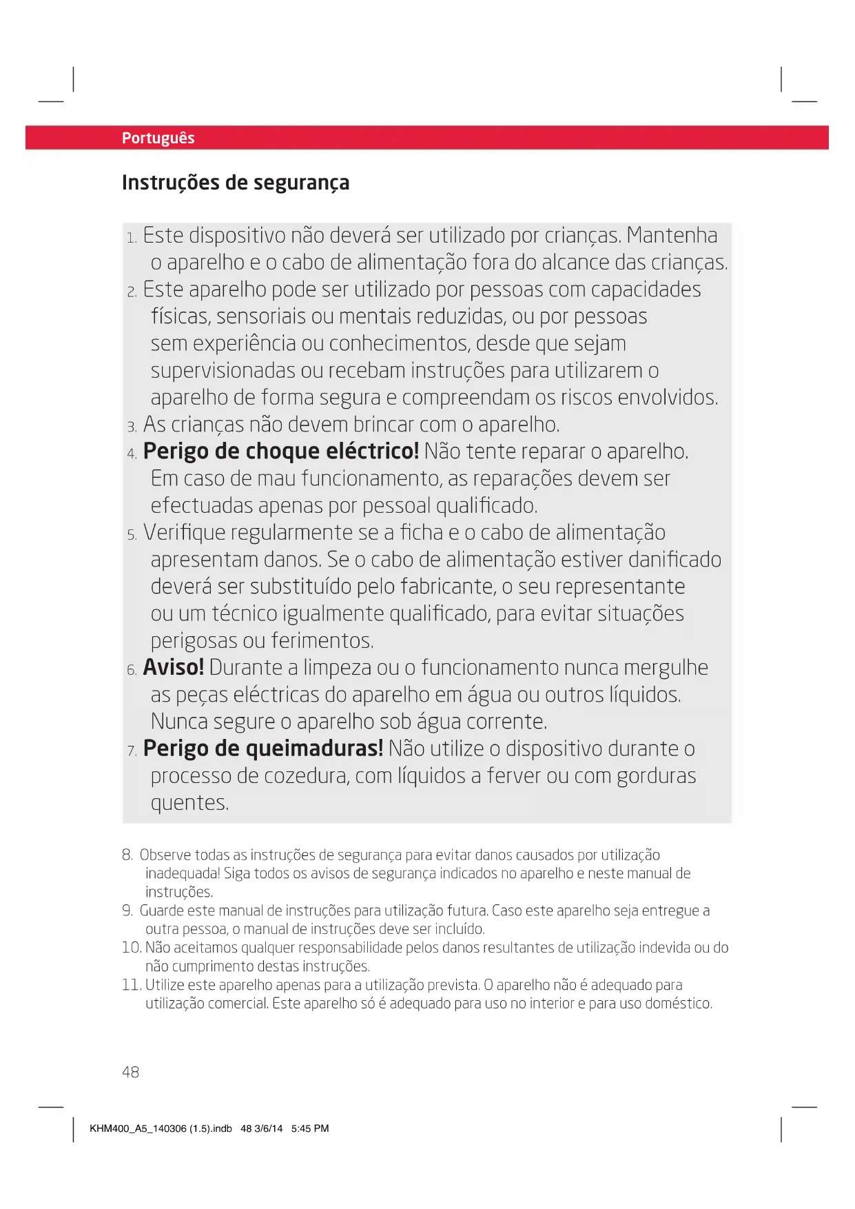 utilização comercial. Este aparelho só é adequado para uso no interior e para uso doméstico. KHM400_A5_140306 (1.5).indb 48 3/6/14 5:45 PM49 Português Instruções de segurança