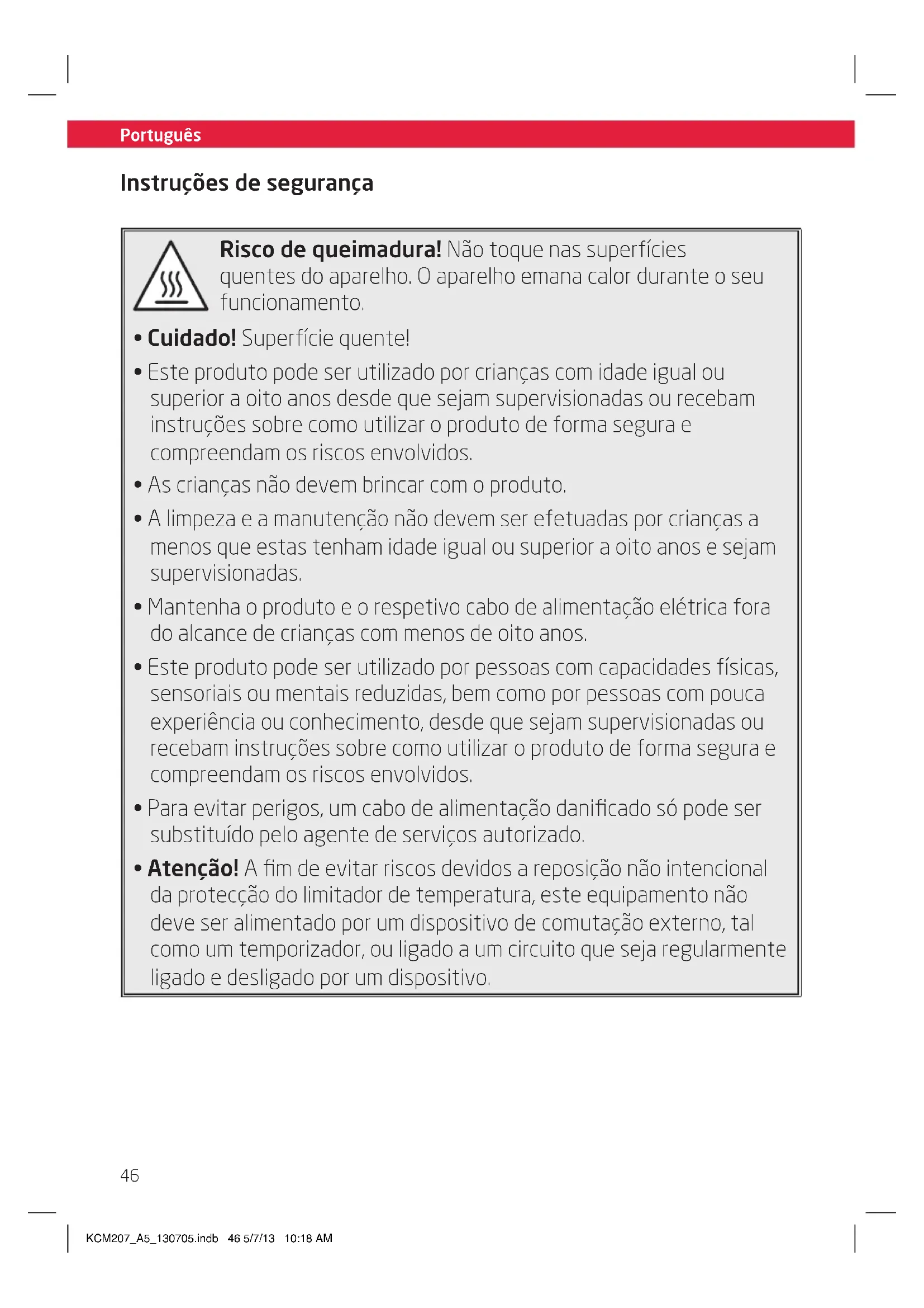 - Atenção! A fim de evitar riscos devidos a reposição não intencional da protecção do limitador de temperatura, este equipamento não deve ser alimentado por um dispositivo de comutação externo, tal como um temporizador, ou ligado a um circuito que seja regularmente ligado e desligado por um dispositivo. KCM207_A5_130705.indb 46 5/7/13 10:18 AMPortuguês