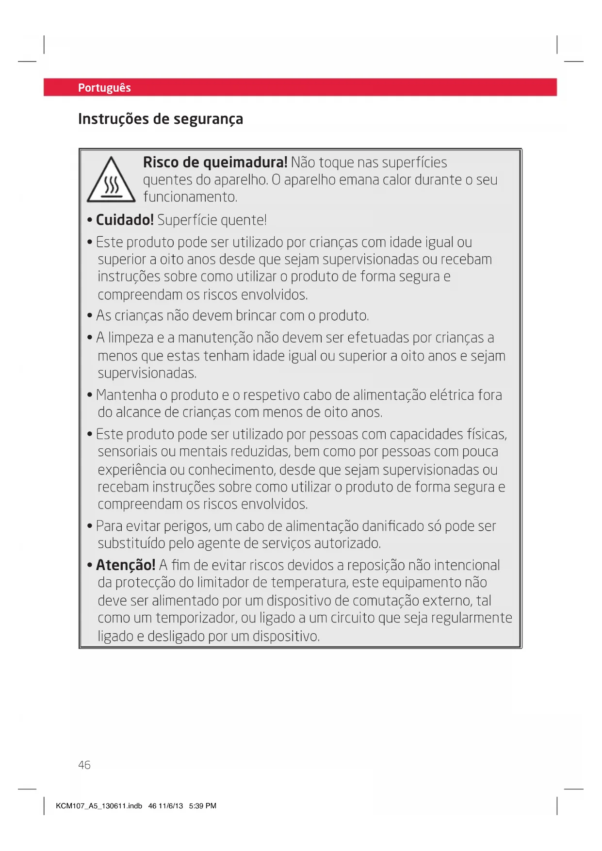 - Atenção! A fim de evitar riscos devidos a reposição não intencional da protecção do limitador de temperatura, este equipamento não deve ser alimentado por um dispositivo de comutação externo, tal como um temporizador, ou ligado a um circuito que seja regularmente ligado e desligado por um dispositivo. KCM107_A5_130611.indb 46 11/6/13 5:39 PMPortuguês