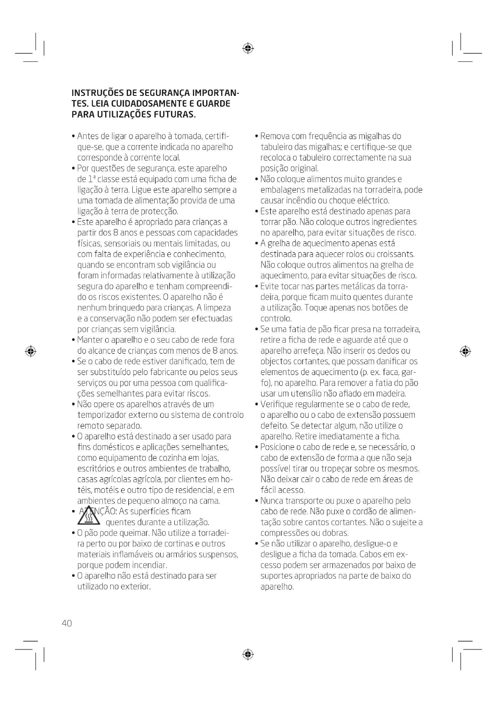- Este aparelho está destinado apenas para torrar pão. Não coloque outros ingredientes no aparelho, para evitar situações de risco.