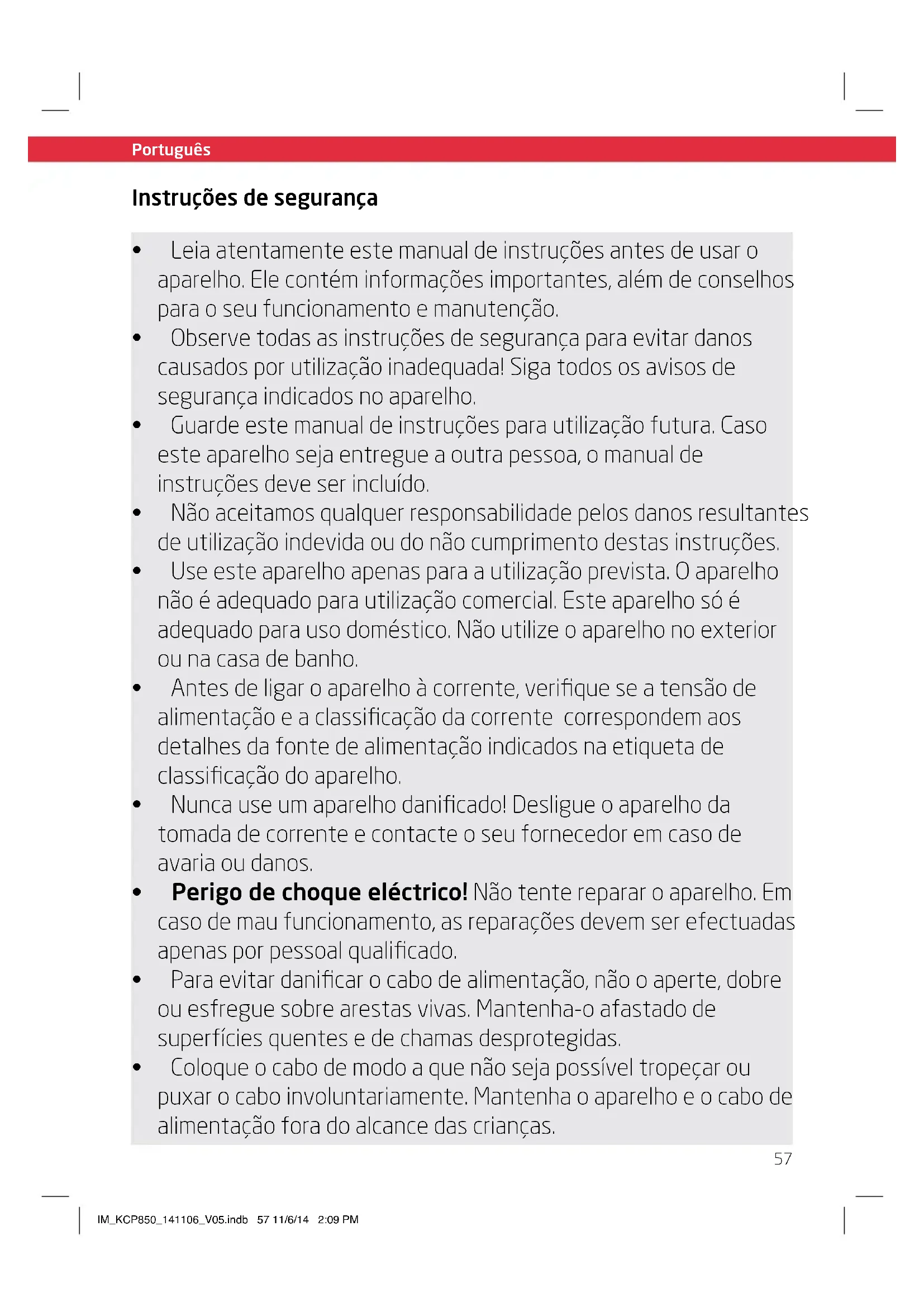 - Coloqueocabodemodoaquenãosejapossíveltropeçarou puxarocaboinvoluntariamente.Mantenhaoaparelhoeocabode alimentaçãoforadoalcancedascrianças. IM_KCP850_141106_V05.indb 57 11/6/14 2:09 PM58 Português Português Instruções de segurança