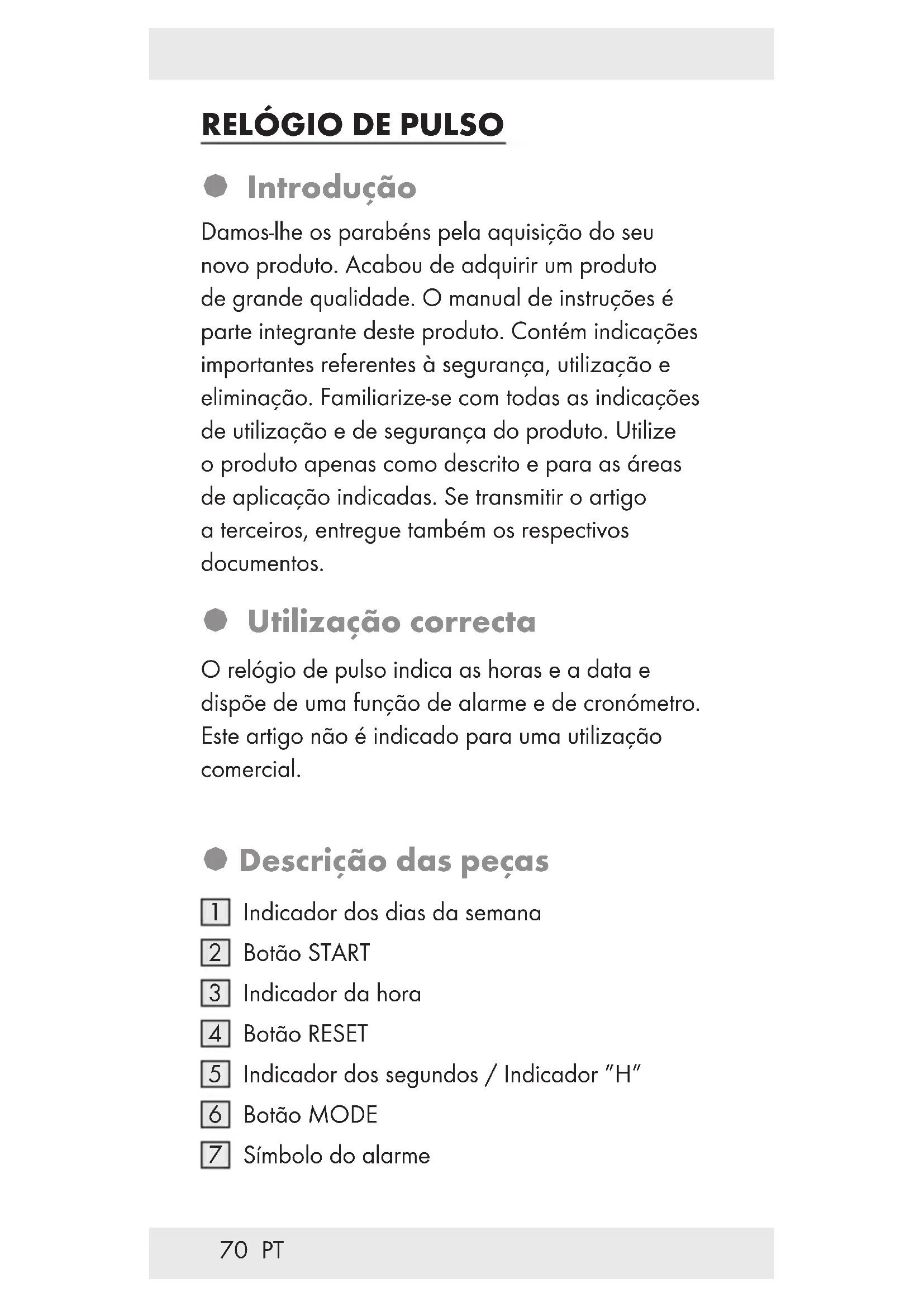 Introdução Damos-lhe os parabéns pela aquisição do seu novo produto. Acabou de adquirir um produto de grande qualidade. O manual de instruções é parte integrante deste produto. Contém indicações importantes referentes à segurança, utilização e eliminação. Familiarize-se com todas as indicações de utilização e de segurança do produto. Utilize o produto apenas como descrito e para as áreas de aplicação indicadas. Se transmitir o artigo a terceiros, entregue também os respectivos documentos. Utilização correcta O relógio de pulso indica as horas e a data e dispõe de uma função de alarme e de cronómetro. Este artigo não é indicado para uma utilização comercial. Descrição das peças