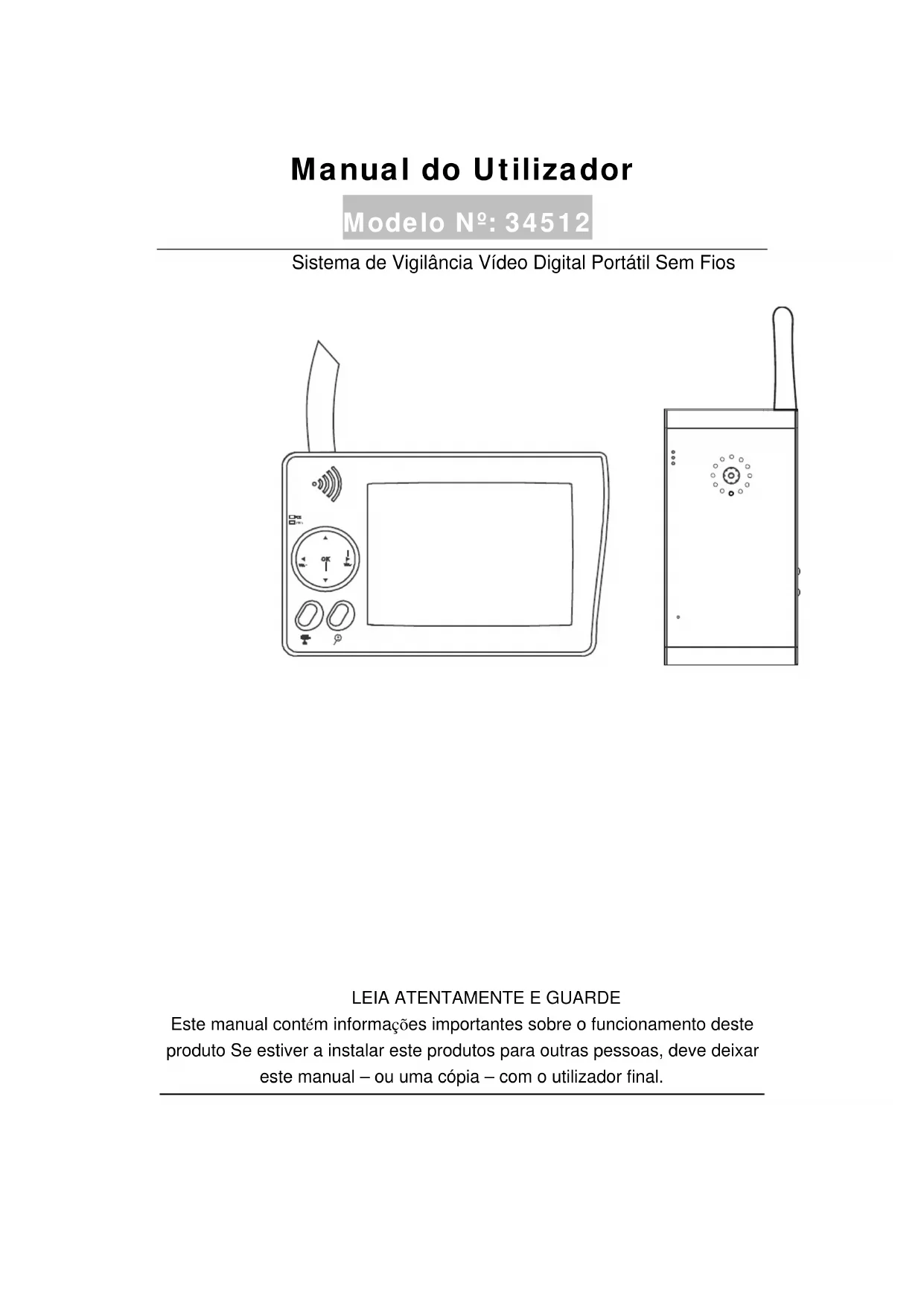 Este manual contém informações importantes sobre o funcionamento deste produto Se estiver a instalar este produtos para outras pessoas, deve deixar este manual – ou uma cópia – com o utilizador final.Sumário Incluído Na Embalagem Precauções de Segurança e Aviso de Perigo / Aviso CFC / Eliminação Conhecer as Peças dos Dispositivos Começar a Utilizar Passo 1: Conhecer a Ligação do Sistema Passo 2: Funcionamento Básico Conhecer os Botões de Função e o Indicador do Monitor No Modo de Visualização Passo 3: Funcionamento Avançado Conhecer o Menu Configurar a Sequência de Rastreio Automático / Manual Configurar o Ecrã QUAD Câmara Emparelhada Configuração e Restauro do Sistema Resolução de Problemas Tabela de Resolução de Problemas Especificação do Produto Incluído Na Embalagem (1) Câmara a Cores Digital Sem Fios (1) Receptor Sem Fios com LCD de 3,5 polegadad (2) Adaptador de Corrente 5V CA/CC para a Câmara e o Receptor (1) Bolsa de parafusos (1) Cabo AV (1) Cabo USB (1) CD de Instalação do Software (2) Manual do Utilizador