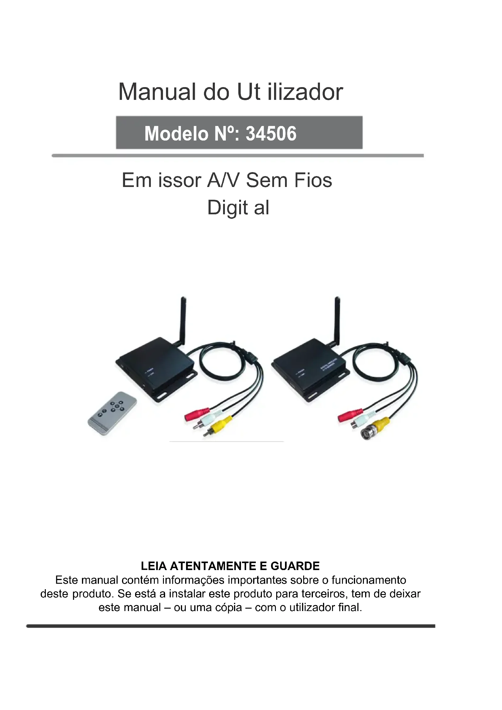 ) ManuaisBEM-VINDO, Estimado utilizador, obrigado por adquirir este produto. Investi mos tempo e esforços no seu desenvolvimento. Apresentamos o emissor A /V digital sem fios com ZERO inte rferências e esperamos que lhe proporcione muitos anos de serviço sem pro blemas e de paz de espírito. Leia atentamente este manual de utili zação antes de instalar ou utilizar estas unidades. Importantes Precauções de Segurança Leia antes de instalar e utilizar este produto. Os danos causados pelo incumprimento deste manual de utilização anulará a garantia! Não assumiremos a responsabilidade por danos causados a itens ou pessoas em resulta do da manip ulação inapropriada ou pelo incumprimento destes avisos de segurança! Qualquer pedido de garantia ficará nula e sem efeito nestes casos.