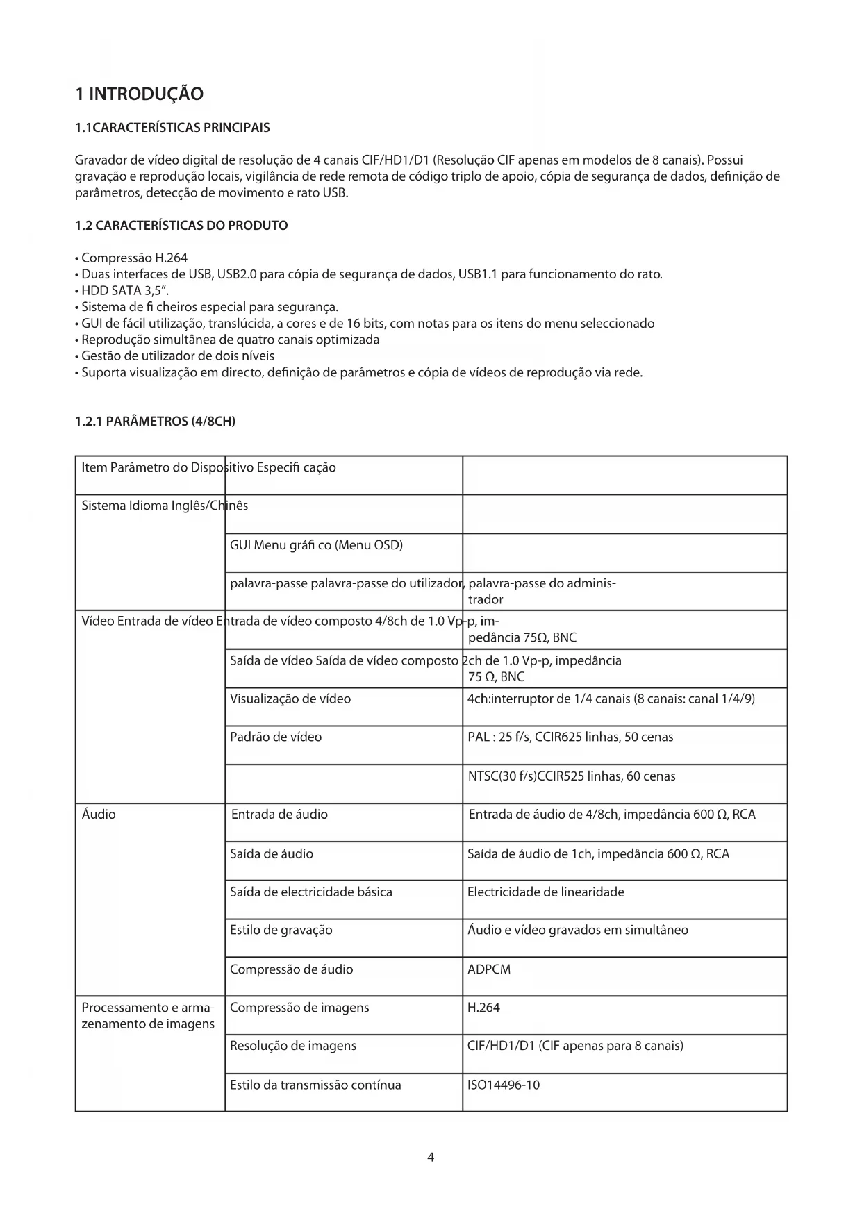 Item Parâmetro do Dispositivo Especi cação Sistema Idioma Inglês/Chinês GUI Menu grá co (Menu OSD) palavra-passe palavra-passe do utilizador, palavra-passe do adminis- trador Vídeo Entrada de vídeo Entrada de vídeo composto 4/8ch de 1.0 Vp-p, im- pedância 75Ω, BNC Saída de vídeo Saída de vídeo composto 2ch de 1.0 Vp-p, impedância 75 Ω, BNC Visualização de vídeo 4ch:interruptor de 1/4 canais (8 canais: canal 1/4/9) Padrão de vídeo PAL : 25 f/s, CCIR625 linhas, 50 cenas NTSC(30 f/s)CCIR525 linhas, 60 cenas Áudio Entrada de áudio Entrada de áudio de 4/8ch, impedância 600 Ω, RCA Saída de áudio Saída de áudio de 1ch, impedância 600 Ω, RCA Saída de electricidade básica Electricidade de linearidade Estilo de gravação Áudio e vídeo gravados em simultâneo Compressão de áudio ADPCM Processamento e arma- zenamento de imagens Compressão de imagens H.264 Resolução de imagens CIF/HD1/D1 (CIF apenas para 8 canais) Estilo da transmissão contínua ISO14496-105 Estilo de áudio ADPCM Taxa de codi cação de vídeo (4CH) CIF: 384~768 Kbps (normal) HD1: 512~1024 Kbps (alta) D1: 512~1024 Kbps (superior) Taxa de codi cação de vídeo (8CH) CIF : 384 Kbps (normal) CIF : 512 Kbps (alta) CIF : 768 Kbps (superior) Taxa de codi cação de áudio 32 KB/s Armazenamento de dados Armazenamento HDD SATA (opcional) Conector Interface de rede RJ45 : 10 M/100 M Alarme Entrada de alarme 4/8 entradas de alarme Saída de alarme 1 saída de alarme Conector Interface de série Suporte 1 RS232 Interface de série Suporte 1 RS485 Interface de rede RJ4510 M/100 M Actualização de soft- ware Actualização de rmware por suporte USB outros Tensão de entrada CA: 110~240V Tensão de saída CC: 19V@3,42/3ª (opcional) Consumo de Energia 6W sem a HDD Temperatura de funcionamento -10°C ----50 °C6