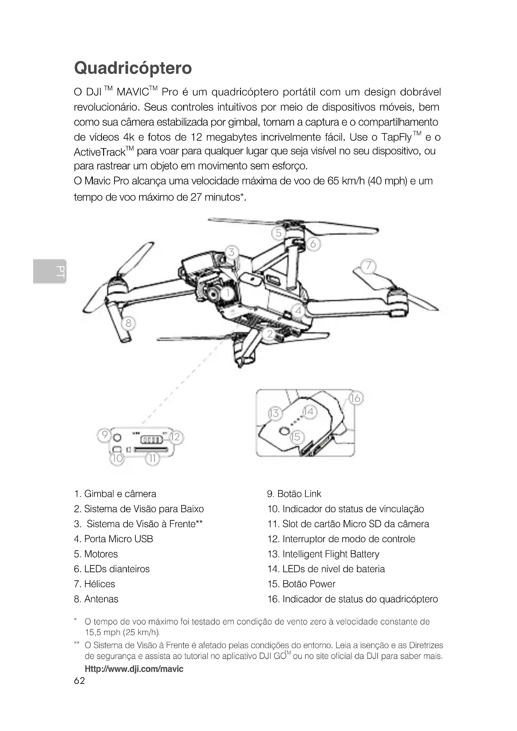 para voar para qualquer lugar que seja visível no seu dispositivo, ou para rastrear um objeto em movimento sem esforço. O Mavic Pro alcança uma velocidade máxima de voo de 65 km/h (40 mph) e um tempo de voo máximo de 27 minutos*.