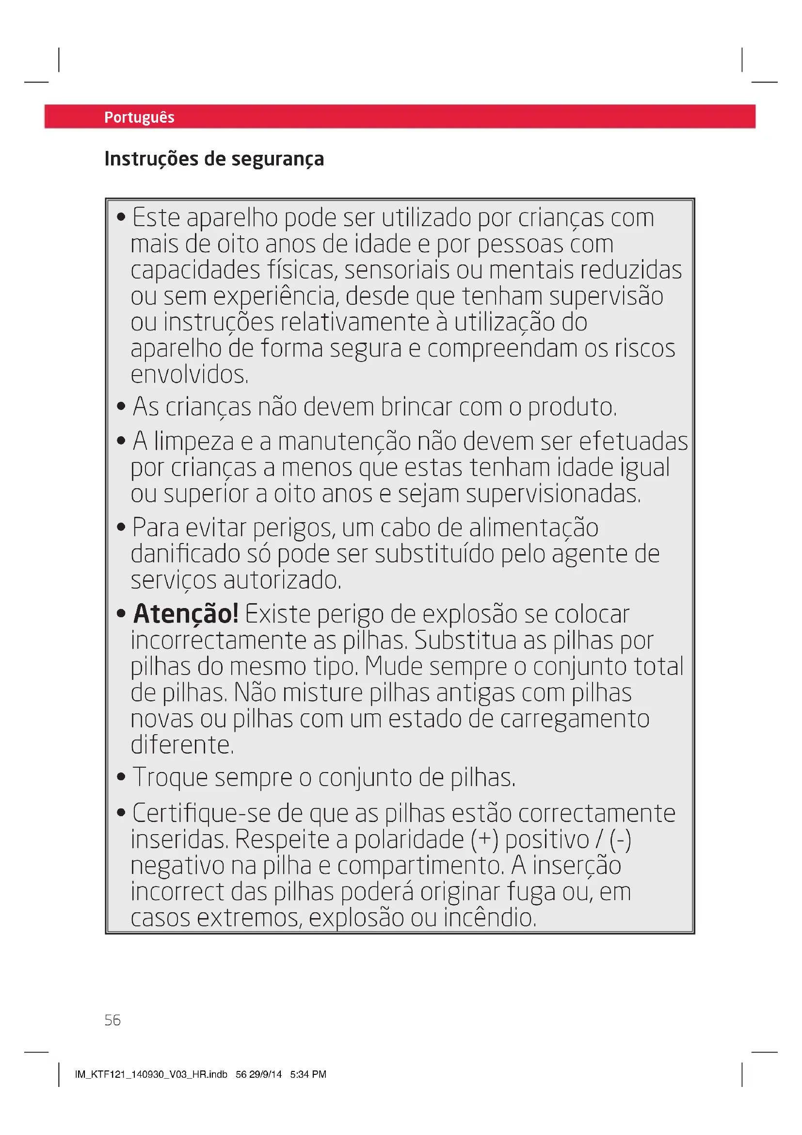 - Certifique-se de que as pilhas estão correctamente inseridas. Respeite a polaridade (+) positivo / (-) negativo na pilha e compartimento. A inserção incorrect das pilhas poderá originar fuga ou, em casos extremos, explosão ou incêndio. IM_KTF121_140930_V03_HR.indb 56 29/9/14 5:34 PMPortuguês