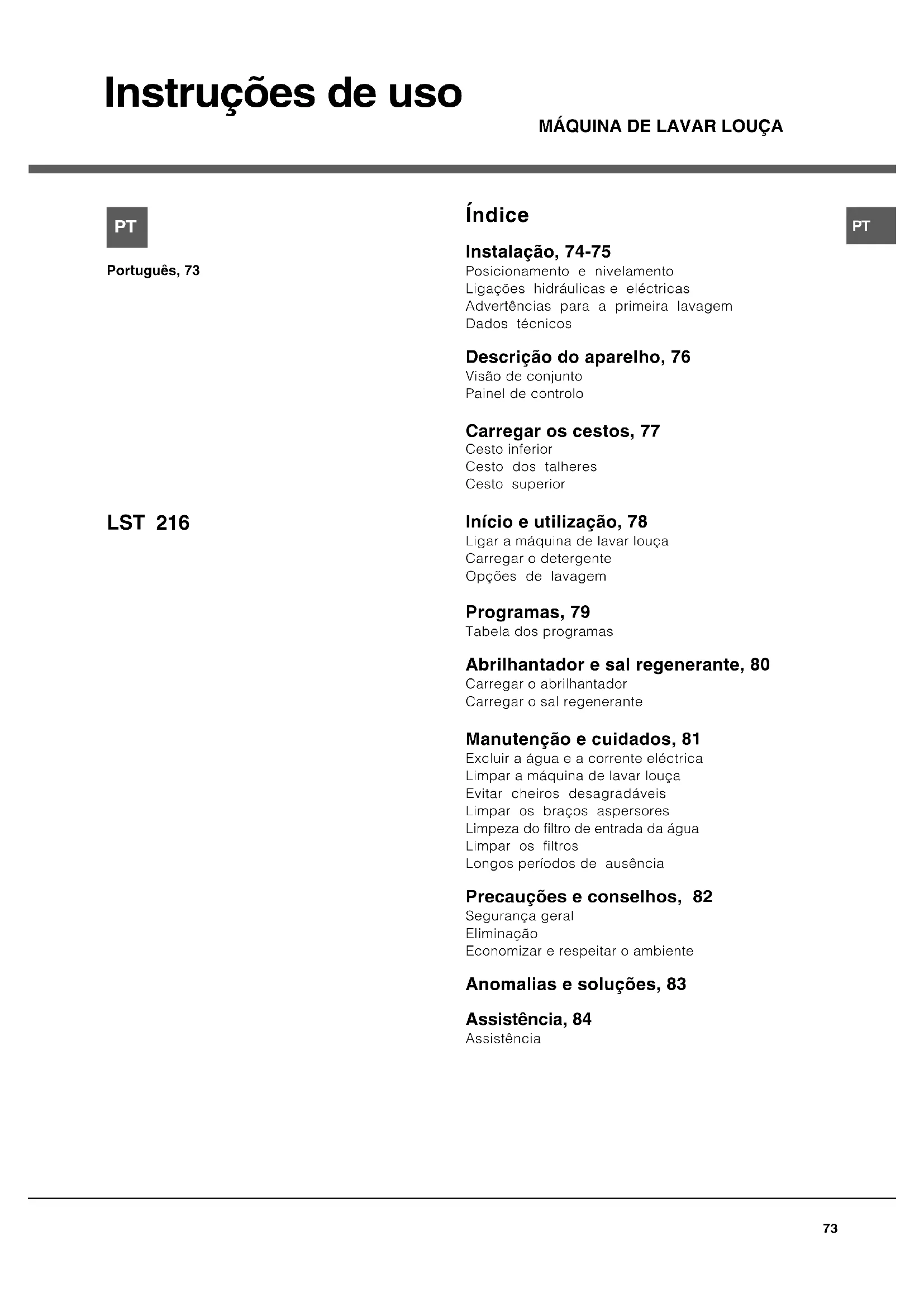 Instruções de uso Índice Instalação, 74-75 Posicionamento e nivelamento Ligações hidráulicas e eléctricas Advertências para a primeira lavagem Dados técnicos Descrição do aparelho, 76 Visão de conjunto Painel de controlo Carregar os cestos, 77 Cesto inferior Cesto dos talheres Cesto superior Início e utilização, 78 Ligar a máquina de lavar louça Carregar o detergente Opções de lavagem Programas, 79 Tabela dos programas Abrilhantador e sal regenerante, 80 Carregar o abrilhantador Carregar o sal regenerante Manutenção e cuidados, 81 Excluir a água e a corrente eléctrica Limpar a máquina de lavar louça Evitar cheiros desagradáveis Limpar os braços aspersores Limpeza do filtro de entrada da água Limpar os filtros Longos períodos de ausência Precauções e conselhos, 82 Segurança geral Eliminação Economizar e respeitar o ambiente Anomalias e soluções, 83 Assistência, 84 Assistência Português, 73