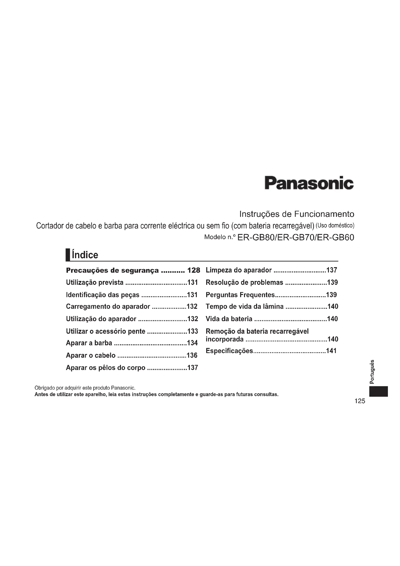 - *apenasparaoER-GB80/ER-GB70 Paraprotecçãoambientalereciclagemdosmateriais EsteaparadorcontémumabateriadeNíquelhidretometálico. Certique-sedequeabateriaéeliminadanumlocaldesignado ocialmente,seexistirumnoseupaís.141 Português Especicações Fontedealimentação Vejaaplacaidenticativanotransformadorde CA. (Conversãoautomáticadevoltagem) Voltagemdomotor 1,2V Tempode carregamento Aprox.1hora Ruídoacústicoaéreo Emmododeaparador:64(dB(A)re1pW) Emmododeaparadordeprecisão ER-GB80/ER-GB70 :63(dB(A)re1pW) Esteprodutofoiconcebidoapenasparautilizaçãodoméstica. InformaçõesparaUtilizadoresreferentesàRecolhae EliminaçãodeEquipamentosVelhoseBaterias. Estessímbolosnosprodutos,embalagense documentossignicamqueosprodutoselétricose elétrónicosusadosnaopodemsermisturadoscomos resíduosurbanos. Paraotratamentoapropriado,recuperaçãoe reciclagemdeprodutosvelhosebateriasusadas, solicitamosqueoscoloqueempontosderecolha próprios,deacordocomaLegislacaoNacionalecom asDirectivasEuropeias2002/96/ECe2006/66/EC. Aeliminaçãocorretadesteprodutoajudaráapoupar recursosvaliososeevitarquaisquerpotenciaisefeitos negativosnasaúdehumanaenoambiente,osquaispoderiam resultardeumtratamentoincorretodeResíduos. Paramaisinformaçõessobrearecolhaereciclagemdeprodutos velhosebaterias,porfavor,contacteasautoridadeslocais responsáveispelarecolhaderesíduosouopontodevendaondeo produtofoiadquirido. Deacordocomalegislaçãonacional,podemseraplicadasmultas casosejafeitaaeliminaçãoincorretadestesresíduos. ParaUtilizadoresNãoParticularesdaUniãoEuropeia Sepretendereliminarequipamentoselétricoseeletrónicos,por favor,contacteoseuDistribuídorouProdutorparaobtermais informações. [InformaçãosobreaeliminaçãonoutrospaísesforadaUnião Europeia] Estessímbolossãoválidos,apenas,naUniãoEuropeia.Se pretendereliminaresteprodutocontacte,porfavor,asautoridades locaisresponsáveispelarecolhaderesíduosouopontodevenda ondeoprodutofoiadquiridoesoliciteinformaçãosobreométodode eliminaçãocorreto.142143 Norsk Brukerinstruksjoner (Husholdnings-) Strømnett/Oppladbarskjegg-/hårtrimmer Modellnr. ER-GB80/ER-GB70/ER-GB60 TakkforatduharkjøptdettePanasonic-produktet. Førdubegynneråbrukeproduktetbervideglesegodtigjennomdenneinformasjonenogtavarepådenforsenerebruk. Sikkerhetsforholdsregler p. 146