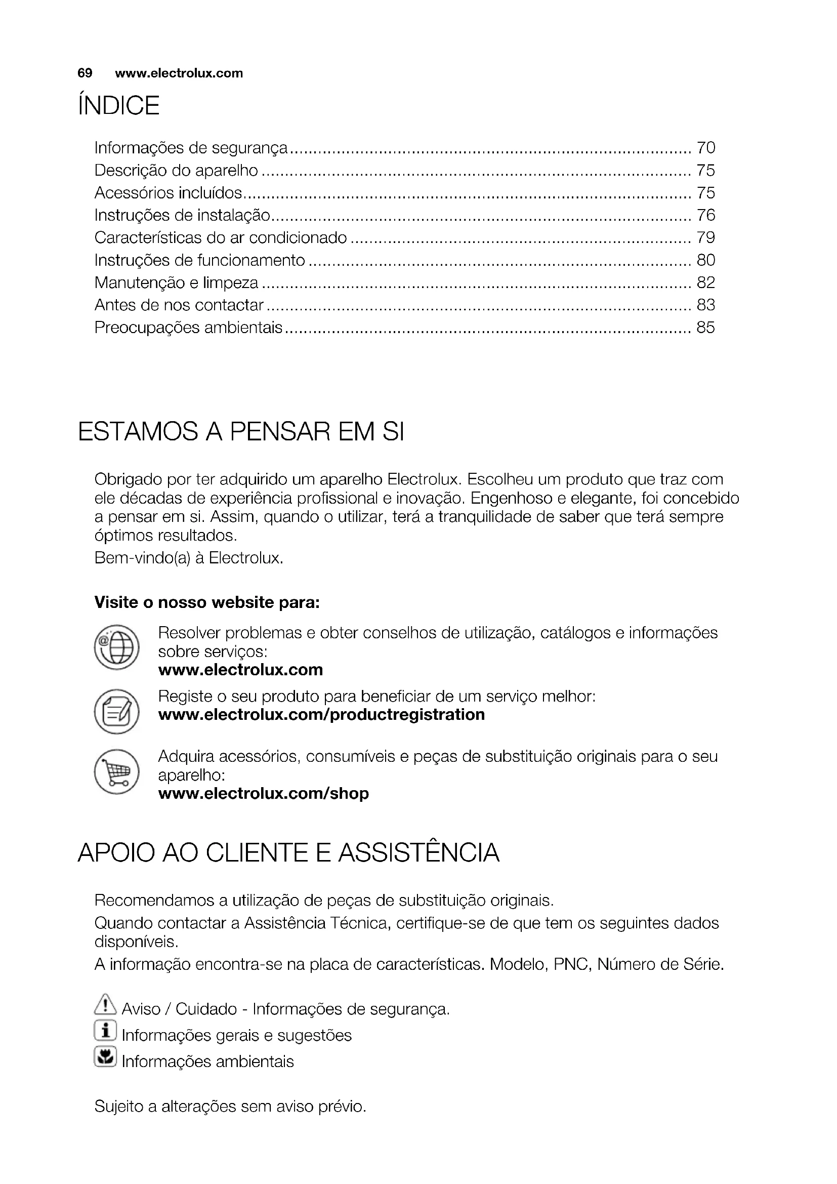 Obrigado por ter adquirido um aparelho Electrolux. Escolheu um produto que traz com ele décadas de experiência profissional e inovação. Engenhoso e elegante, foi concebido a pensar em si. Assim, quando o utilizar, terá a tranquilidade de saber que terá sempre óptimos resultados. Bem-vindo(a) à Electrolux. Visite o nosso website para: Resolver problemas e obter conselhos de utilização, catálogos e informações sobre serviços: www.electrolux.com Registe o seu produto para beneficiar de um serviço melhor: www.electrolux.com/productregistration Adquira acessórios, consumíveis e peças de substituição originais para o seu aparelho: www.electrolux.com/shop "10*0"0$-*&/5&&"44*45³/$*" Recomendamos a utilização de peças de substituição originais. Quando contactar a Assistência Técnica, certifique-se de que tem os seguintes dados disponíveis.