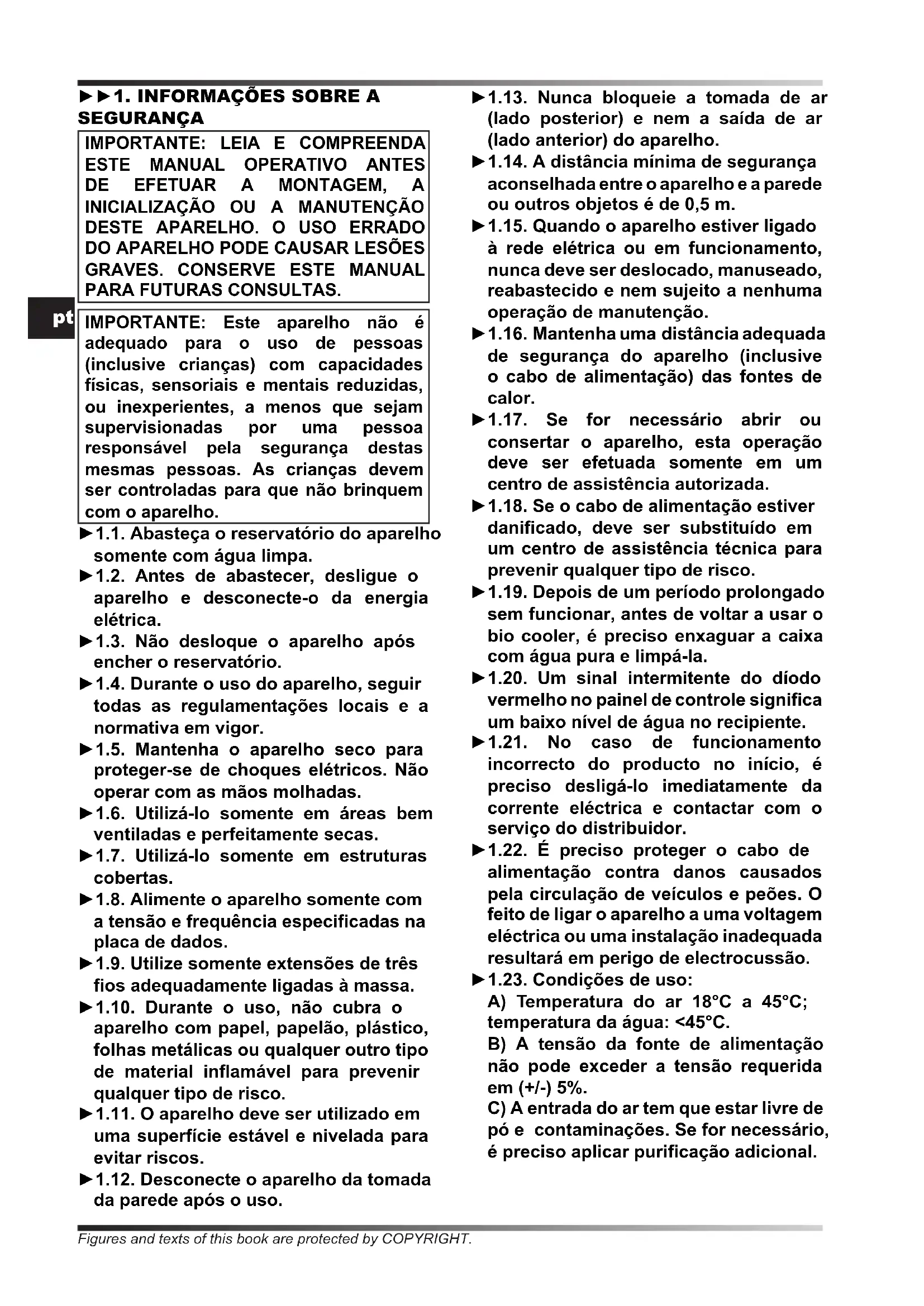PARA FUTURAS CONSULTAS. IMPORTANTE: Este aparelho não é adequado para o uso de pessoas (inclusive crianças) com capacidades físicas, sensoriais e mentais reduzidas, ou inexperientes, a menos que sejam supervisionadas por uma pessoa responsável pela segurança destas mesmas pessoas. As crianças devem ser controladas para que não brinquem com o aparelho. ►1.1. Abasteça o reservatório do aparelho somente com água limpa. ►1.2. Antes de abastecer, desligue o aparelho e desconecte-o da energia elétrica. ►1.3. Não desloque o aparelho após encher o reservatório. ►1.4. Durante o uso do aparelho, seguir todas as regulamentações locais e a normativa em vigor. ►1.5. Mantenha o aparelho seco para proteger-se de choques elétricos. Não operar com as mãos molhadas. ►1.6. Utilizá-lo somente em áreas bem ventiladas e perfeitamente secas. ►1.7. Utilizá-lo somente em estruturas cobertas. ►1.8. Alimente o aparelho somente com a tensão e frequência especicadas na placa de dados. ►1.9. Utilize somente extensões de três os adequadamente ligadas à massa. ►1.10. Durante o uso, não cubra o aparelho com papel, papelão, plástico, folhas metálicas ou qualquer outro tipo de material inamável para prevenir qualquer tipo de risco. ►1.11. O aparelho deve ser utilizado em uma superfície estável e nivelada para evitar riscos. ►1.12. Desconecte o aparelho da tomada da parede após o uso. ►1.13. Nunca bloqueie a tomada de ar (lado posterior) e nem a saída de ar (lado anterior) do aparelho. ►1.14. A distância mínima de segurança aconselhada entre o aparelho e a parede ou outros objetos é de 0,5 m. ►1.15. Quando o aparelho estiver ligado à rede elétrica ou em funcionamento, nunca deve ser deslocado, manuseado, reabastecido e nem sujeito a nenhuma operação de manutenção. ►1.16. Mantenha uma distância adequada de segurança do aparelho (inclusive o cabo de alimentação) das fontes de calor. ►1.17. Se for necessário abrir ou consertar o aparelho, esta operação deve ser efetuada somente em um centro de assistência autorizada. ►1.18. Se o cabo de alimentação estiver danicado, deve ser substituído em um centro de assistência técnica para prevenir qualquer tipo de risco. ►1.19. Depois de um período prolongado sem funcionar, antes de voltar a usar o bio cooler, é preciso enxaguar a caixa com água pura e limpá-la. ►1.20. Um sinal intermitente do díodo vermelho no painel de controle signica um baixo nível de água no recipiente. ►1.21. No caso de funcionamento incorrecto do producto no início, é preciso desligá-lo imediatamente da corrente eléctrica e contactar com o serviço do distribuidor. ►1.22. É preciso proteger o cabo de alimentação contra danos causados pela circulação de veículos e peões. O feito de ligar o aparelho a uma voltagem eléctrica ou uma instalação inadequada resultará em perigo de electrocussão. ►1.23. Condições de uso: A) Temperatura do ar 18°C a 45°C; temperatura da água: <45°C. B) A tensão da fonte de alimentação não pode exceder a tensão requerida em (+/-) 5%. C) A entrada do ar tem que estar livre de pó e contaminações. Se for necessário, é preciso aplicar puricação adicional. Figures and texts of this book are protected by COPYRIGHT.pt ►►2. DESEMBALAGEM ►2.1. Remova todos os materiais de embalagem utilizados para confecionar e enviar o aparelho e elimine-os segundo as normas em vigor. ►2.2. Extraia todos os artigos da embalagem. ►2.3. Controle para vericar se houve danos ocorridos durante o transporte. Se o aparelho estiver danicado, informe imediatamente o concessionário onde foi adquirido. ►►3. MONTAGEM O aparelho é dotado de rodas para facilitar a movimentação. Dependendo do modelo, as rodas podem estar já instaladas ou não. Os componentes com os respectivos parafusos e porcas de montagem encontram-se dentro da embalagem (Fig. 1). ►►4. FUNCIONAMENTO ADVERTÊNCIA: Leia atentamente as