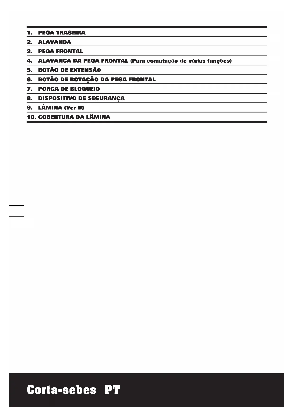 Quando quiser cortar normalmente na horizontal ou na vertical (de lado), recomendamos-lhe que não estenda a pega traseira e que use a pega frontal nas duas posições mais avançadas. Quando precisar de um alcance maior terá de estender a pega traseira e usar a pega frontal nas duas posições mais recuadas. Isto irá aumentar o seu alcance e permitir-lhe manter um controlo estável(Ver H). A pega frontal inclui uma alavanca de comutação que pode ser activada em três lados. Se segurar na ferramenta pela parte superior ou de cada um dos lados da pegaCorta-sebes PT