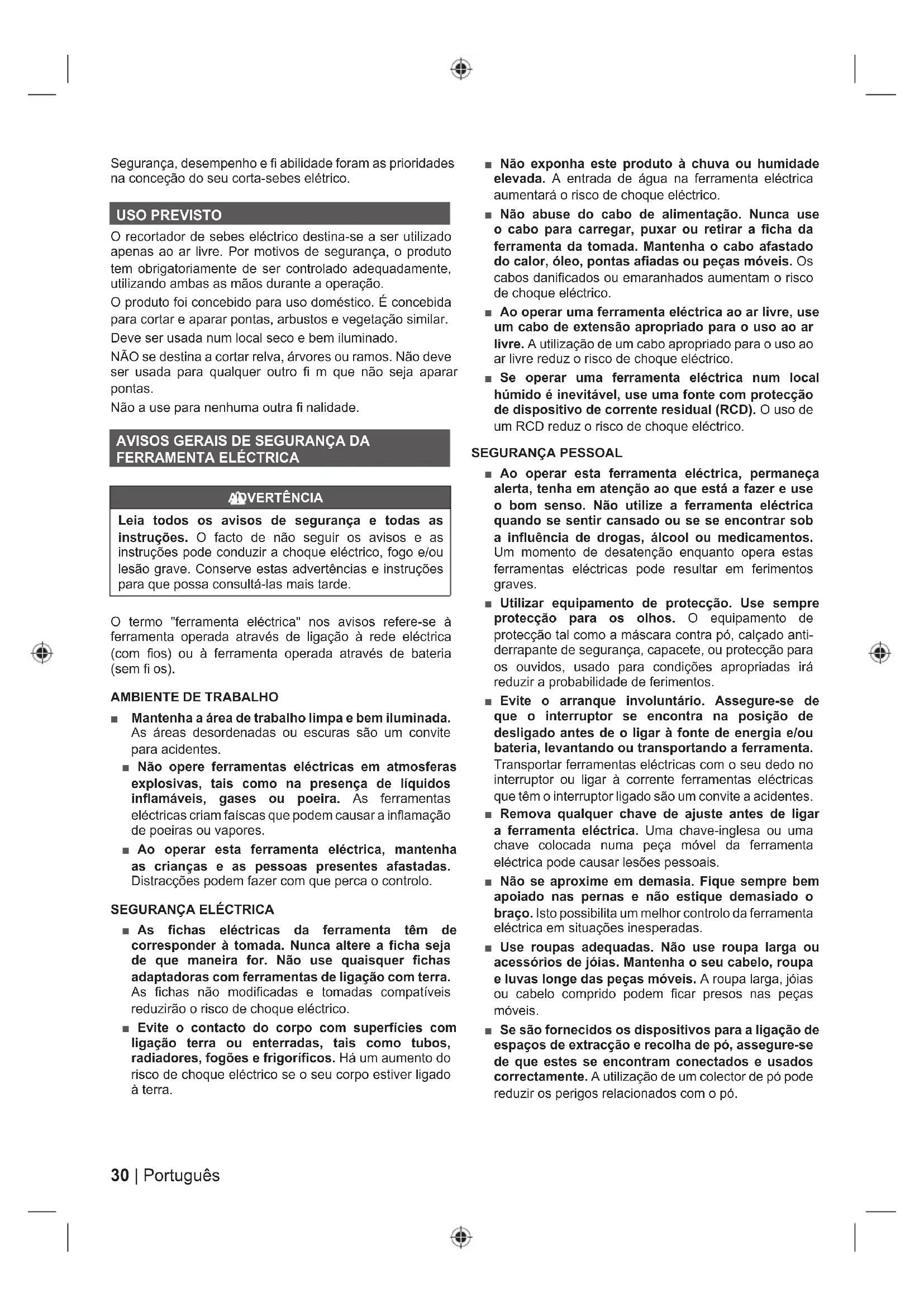 ADVERTÊNCIA Leia todos os avisos de segurança e todas as instruções. O facto de não seguir os avisos e as instruções pode conduzir a choque eléctrico, fogo e/ou lesão grave. Conserve estas advertências e instruções para que possa consultá-las mais tarde. O termo "ferramenta eléctrica" nos avisos refere-se à ferramenta operada através de ligação à rede eléctrica (com fi os) ou à ferramenta operada através de bateria (sem fi os).