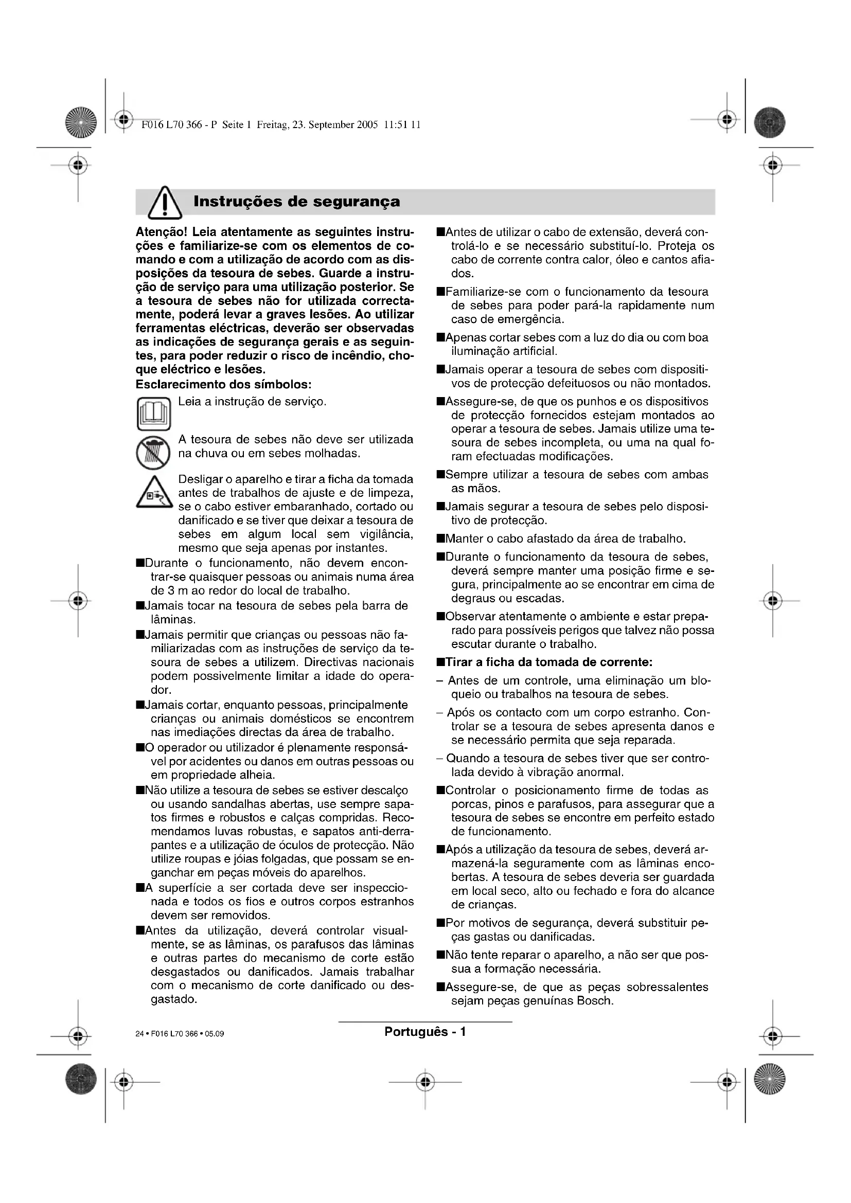 100 dB (A) (AHS 6000/7000 PRO-T). Procedi- miento para evaluación de la conformidad según apéndice V. Leinfelden, 01.10.2005. Dr. Egbert Schneider Dr. Eckerhard Strötgen Senior Vice President Head of Product Engineering Certification Robert Bosch GmbH, Power Tools Division Reservado el derecho de modificaciones Eliminación Servicio de asistencia técnica Declaración de conformidad F016 L70 366 - Buch Seite 5 Freitag, 23. September 2005 11:14 11 23 • F016 L70 366 • 05.09Português - 1 Atenção! Leia atentamente as seguintes instru- ções e familiarize-se com os elementos de co- mando e com a utilização de acordo com as dis- posições da tesoura de sebes. Guarde a instru- ção de serviço para uma utilização posterior. Se a tesoura de sebes não for utilizada correcta- mente, poderá levar a graves lesões. Ao utilizar ferramentas eléctricas, deverão ser observadas as indicações de segurança gerais e as seguin- tes, para poder reduzir o risco de incêndio, cho- que eléctrico e lesões. Esclarecimento dos símbolos: Leia a instrução de serviço. A tesoura de sebes não deve ser utilizada na chuva ou em sebes molhadas. Desligar o aparelho e tirar a ficha da tomada antes de trabalhos de ajuste e de limpeza, se o cabo estiver embaranhado, cortado ou danificado e se tiver que deixar a tesoura de sebes em algum local sem vigilância, mesmo que seja apenas por instantes. ■ Durante o funcionamento, não devem encon- trar-se quaisquer pessoas ou animais numa área de 3 m ao redor do local de trabalho. ■ Jamais tocar na tesoura de sebes pela barra de lâminas. ■ Jamais permitir que crianças ou pessoas não fa- miliarizadas com as instruções de serviço da te- soura de sebes a utilizem. Directivas nacionais podem possivelmente limitar a idade do opera- dor. ■ Jamais cortar, enquanto pessoas, principalmente crianças ou animais domésticos se encontrem nas imediações directas da área de trabalho. ■ O operador ou utilizador é plenamente responsá- vel por acidentes ou danos em outras pessoas ou em propriedade alheia. ■ Não utilize a tesoura de sebes se estiver descalço ou usando sandalhas abertas, use sempre sapa- tos firmes e robustos e calças compridas. Reco- mendamos luvas robustas, e sapatos anti-derra- pantes e a utilização de óculos de protecção. Não utilize roupas e jóias folgadas, que possam se en- ganchar em peças móveis do aparelhos. ■ A superfície a ser cortada deve ser inspeccio- nada e todos os fios e outros corpos estranhos devem ser removidos. ■ Antes da utilização, deverá controlar visual- mente, se as lâminas, os parafusos das lâminas e outras partes do mecanismo de corte estão desgastados ou danificados. Jamais trabalhar com o mecanismo de corte danificado ou des- gastado. ■ Antes de utilizar o cabo de extensão, deverá con- trolá-lo e se necessário substituí-lo. Proteja os cabo de corrente contra calor, óleo e cantos afia- dos. ■ Familiarize-se com o funcionamento da tesoura de sebes para poder pará-la rapidamente num caso de emergência. ■ Apenas cortar sebes com a luz do dia ou com boa iluminação artificial. ■ Jamais operar a tesoura de sebes com dispositi- vos de protecção defeituosos ou não montados. ■ Assegure-se, de que os punhos e os dispositivos de protecção fornecidos estejam montados ao operar a tesoura de sebes. Jamais utilize uma te- soura de sebes incompleta, ou uma na qual fo- ram efectuadas modificações. ■ Sempre utilizar a tesoura de sebes com ambas as mãos. ■ Jamais segurar a tesoura de sebes pelo disposi- tivo de protecção. ■ Manter o cabo afastado da área de trabalho. ■ Durante o funcionamento da tesoura de sebes, deverá sempre manter uma posição firme e se- gura, principalmente ao se encontrar em cima de degraus ou escadas. ■ Observar atentamente o ambiente e estar prepa- rado para possíveis perigos que talvez não possa escutar durante o trabalho. ■ Tirar a ficha da tomada de corrente: – Antes de um controle, uma eliminação um blo- queio ou trabalhos na tesoura de sebes. – Após os contacto com um corpo estranho. Con- trolar se a tesoura de sebes apresenta danos e se necessário permita que seja reparada. – Quando a tesoura de sebes tiver que ser contro- lada devido à vibração anormal. ■ Controlar o posicionamento firme de todas as porcas, pinos e parafusos, para assegurar que a tesoura de sebes se encontre em perfeito estado de funcionamento. ■ Após a utilização da tesoura de sebes, deverá ar- mazená-la seguramente com as lâminas enco- bertas. A tesoura de sebes deveria ser guardada em local seco, alto ou fechado e fora do alcance de crianças. ■ Por motivos de segurança, deverá substituir pe- ças gastas ou danificadas. ■ Não tente reparar o aparelho, a não ser que pos- sua a formação necessária. ■ Assegure-se, de que as peças sobressalentes sejam peças genuínas Bosch. Instruções de segurança F016 L70 366 - P Seite 1 Freitag, 23. September 2005 11:51 11 24 • F016 L70 366 • 05.09Português - 2 O aparelho é destinado para cortar e aparar sebes vivas e arbustos em jardins domésticos e de passa- tempo. Este manual contém instruções sobre a montagem e a utilização correcta da sua tesoura de sebes. É impor- tante, que estas instruções sejam lidas atentamente. Todas as peças do aparelho devem ser retiradas cuidadosamente da embalagem e deverá controlar se está tudo completo: – Tesoura de sebes – Protecção da lâmina – Instrução de serviço Se quaisquer peças estiverem faltando ou danificadas, di- rija-se ao seu revendedor autorizado. 1 Barra de lâminas 2 Protecção para as mãos no punho anterior 3 Arco anterior do punho com alavanca de comu- tação 4 Aberturas de ventilação 5 Punho traseiro com interruptor de ligar-desligar 6 Ficha de rede** 7 Protecção para as lâminas 8 Número de série **específico para cada país Os acessórios ilustrados e descritos nas instruções de servi