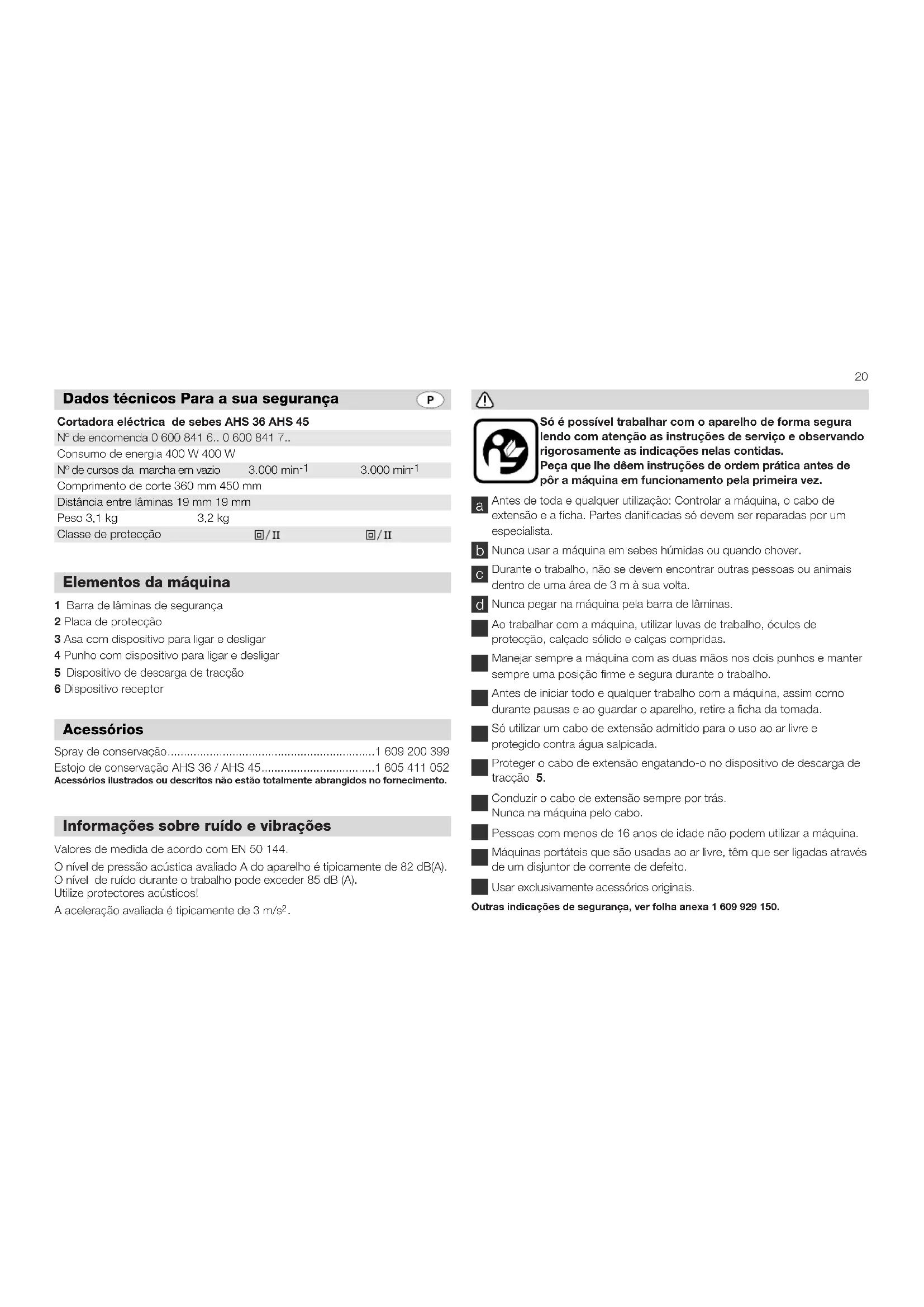 Dr. Eckerhard Strötgen Dr. Alfred Odendahl Robert Bosch GmbH, Geschäftsbereich Elektrowerkzeuge Declaracion de conformidad20 1 Barra de lâminas de segurança 2 Placa de protecção 3 Asa com dispositivo para ligar e desligar 4 Punho com dispositivo para ligar e desligar 5 Dispositivo de descarga de tracção 6 Dispositivo receptor Elementos da máquina Acessórios Dados técnicos Para a sua segurança Spray de conservação................................................................1 609 200 399 Estojo de conservação AHS 36 / AHS 45...................................1 605 411 052 Acessórios ilustrados ou descritos não estão totalmente abrangidos no fornecimento. Valores de medida de acordo com EN 50 144. O nível de pressão acústica avaliado A do aparelho é tipicamente de 82 dB(A). O nível de ruído durante o trabalho pode exceder 85 dB (A). Utilize protectores acústicos! A aceleração avaliada é tipicamente de 3 m/s