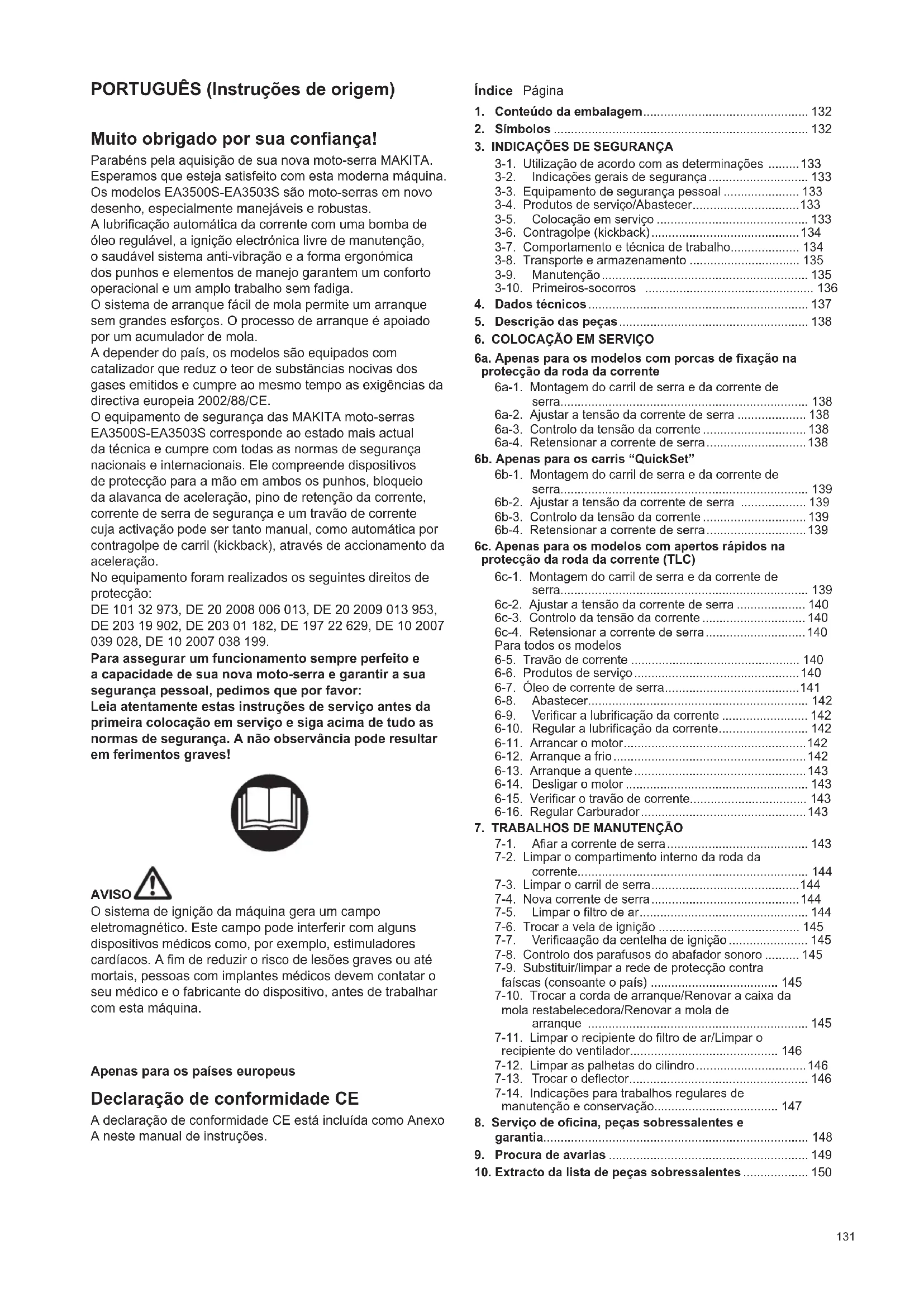 Depósito combinado (para 5l combust., 3l aceite para cadenas)131 PORTUGUÊS (Instruções de origem) Muito obrigado por sua conança! Parabéns pela aquisição de sua nova moto-serra MAKITA. Esperamos que esteja satisfeito com esta moderna máquina. Os modelos EA3500S-EA3503S são moto-serras em novo desenho, especialmente manejáveis e robustas. A lubricação automática da corrente com uma bomba de óleo regulável, a ignição electrónica livre de manutenção, o saudável sistema anti-vibração e a forma ergonómica dos punhos e elementos de manejo garantem um conforto operacional e um amplo trabalho sem fadiga. O sistema de arranque fácil de mola permite um arranque sem grandes esforços. O processo de arranque é apoiado por um acumulador de mola. A depender do país, os modelos são equipados com catalizador que reduz o teor de substâncias nocivas dos gases emitidos e cumpre ao mesmo tempo as exigências da directiva europeia 2002/88/CE. O equipamento de segurança das MAKITA moto-serras EA3500S-EA3503S corresponde ao estado mais actual da técnica e cumpre com todas as normas de segurança nacionais e internacionais. Ele compreende dispositivos de protecção para a mão em ambos os punhos, bloqueio da alavanca de aceleração, pino de retenção da corrente, corrente de serra de segurança e um travão de corrente cuja activação pode ser tanto manual, como automática por contragolpe de carril (kickback), através de accionamento da aceleração. No equipamento foram realizados os seguintes direitos de protecção: DE 101 32 973, DE 20 2008 006 013, DE 20 2009 013 953, DE 203 19 902, DE 203 01 182, DE 197 22 629, DE 10 2007 039 028, DE 10 2007 038 199. Para assegurar um funcionamento sempre perfeito e a capacidade de sua nova moto-serra e garantir a sua segurança pessoal, pedimos que por favor: Leia atentamente estas instruções de serviço antes da primeira colocação em serviço e siga acima de tudo as normas de segurança. A não observância pode resultar em ferimentos graves! AVISO O sistema de ignição da máquina gera um campo eletromagnético. Este campo pode interferir com alguns dispositivos médicos como, por exemplo, estimuladores cardíacos. A m de reduzir o risco de lesões graves ou até mortais, pessoas com implantes médicos devem contatar o seu médico e o fabricante do dispositivo, antes de trabalhar com esta máquina. Apenas para os países europeus Declaração de conformidade CE A declaração de conformidade CE está incluída como Anexo A neste manual de instruções. Índice Página