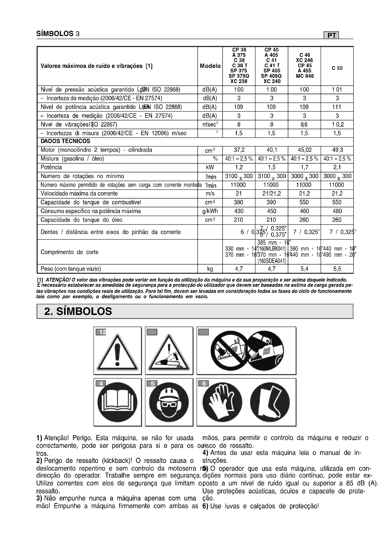 na sua posição original. No caso de utilizar a máquina na modalidade antigelo a temperaturas superiores, po- dem haver dificuldades no arranque do motor no e fun- cionamento do motor a velocidades incorrectas. Por isso verifique sempre se voltou a colocar a máquina no modo de funcionamento normal (com o símbolo "SOL" para cima) se já não houver o perigo de formação de gelo. NOTADeve ser lembrado sempre que uma motosserra usada incorrectamente pode incomodar os outros e causar um grande impacto no ambiente. Para o respeito dos outros e do ambiente: – Evite de usar a máquina em ambientes e horários que possam incomodar. – Siga rigorosamente as normas locais para a elimina- ção dos materiais residuais depois do corte. – Siga rigorosamente as normas locais para a elimina- ção de óleos, partes deterioradas ou qualquer ele- mento com grande impacto ambiental. – Durante o trabalho, é eliminada no ambiente uma certa quantidade de óleo, necessário para a lubrifica- ção da corrente; por isto, use somente óleos biode- gradáveis, específicos para este tipo de utilização. – Para evitar o risco de incêndio, não deixe a máquina com o motor quente entre as folhas ou relva seca. Use uma roupa adequada du- rante o trabalho. O seu Revendedor pode fornecer- lhe as informações mas fiáveis sobre os materiais de protecção contra acidentes de modo a garantir a segurança no trabalho. Utilize luvas anti-vibração. Nenhuma das precauções mencionadas acima garante a prevenção do risco do fenómeno de Raynaud ou da síndrome do túnel carpal. Por con- seguinte, recomenda-se a quem utiliza prolon- gadamente esta máquina que verifique periodica- mente as condições das suas mãos e dedos. Caso ocorra algum dos sintomas acima indicados, consulte imediatamente um médico. O uso da máquina para o abate e a desramação exige um adestramento es- pecífico.
