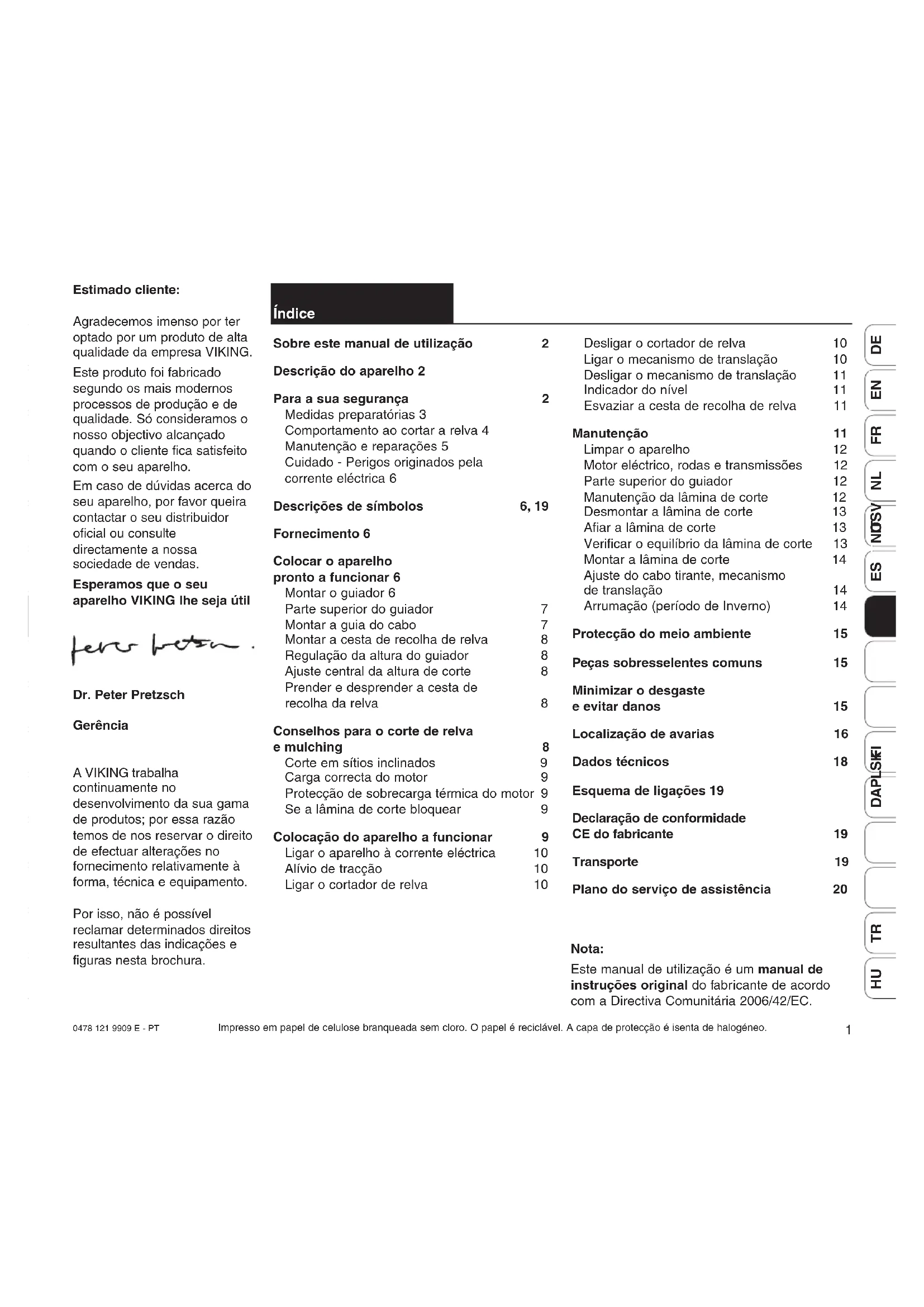 Estimado cliente: Agradecemos imenso por ter optado por um produto de alta qualidade da empresa VIKING. Este produto foi fabricado segundo os mais modernos processos de produção e de qualidade. Só consideramos o nosso objectivo alcançado quando o cliente fica satisfeito com o seu aparelho. Em caso de dúvidas acerca do seu aparelho, por favor queira contactar o seu distribuidor oficial ou consulte directamente a nossa sociedade de vendas. Esperamos que o seu aparelho VIKING lhe seja útil Dr. Peter Pretzsch Gerência A VIKING trabalha continuamente no desenvolvimento da sua gama de produtos; por essa razão temos de nos reservar o direito de efectuar alterações no fornecimento relativamente à forma, técnica e equipamento. Por isso, não é possível reclamar determinados direitos resultantes das indicações e figuras nesta brochura. Índice Sobre este manual de utilização2 Descrição do aparelho 2 Para a sua segurança2 Medidas preparatórias 3 Comportamento ao cortar a relva 4 Manutenção e reparações 5 Cuidado - Perigos originados pela corrente eléctrica 6 Descrições de símbolos 6, 19 Fornecimento 6 Colocar o aparelho pronto a funcionar 6 Montar o guiador 6 Parte superior do guiador 7 Montar a guia do cabo 7 Montar a cesta de recolha de relva 8 Regulação da altura do guiador 8 Ajuste central da altura de corte 8 Prender e desprender a cesta de recolha da relva 8 Conselhos para o corte de relva e mulching 8 Corte em sítios inclinados 9 Carga correcta do motor 9 Protecção de sobrecarga térmica do motor 9 Se a lâmina de corte bloquear 9 Colocação do aparelho a funcionar 9 Ligar o aparelho à corrente eléctrica 10 Alívio de tracção 10 Ligar o cortador de relva 10 Desligar o cortador de relva 10 Ligar o mecanismo de translação 10 Desligar o mecanismo de translação 11 Indicador do nível 11 Esvaziar a cesta de recolha de relva 11 Manutenção11 Limpar o aparelho 12 Motor eléctrico, rodas e transmissões 12 Parte superior do guiador 12 Manutenção da lâmina de corte 12 Desmontar a lâmina de corte 13 Afiar a lâmina de corte 13 Verificar o equilíbrio da lâmina de corte 13 Montar a lâmina de corte 14 Ajuste do cabo tirante, mecanismo de translação 14 Arrumação (período de Inverno) 14 Protecção do meio ambiente 15 Peças sobresselentes comuns 15 Minimizar o desgaste e evitar danos 15 Localização de avarias 16 Dados técnicos 18 Esquema de ligações 19 Declaração de conformidade CE do fabricante 19 Transporte 19 Plano do serviço de assistência 20 Nota: Este manual de utilização é um manual de instruções original do fabricante de acordo com a Directiva Comunitária 2006/42/EC. Impresso em papel de celulose branqueada sem cloro. O papel é reciclável. A capa de protecção é isenta de halogéneo. 0478_121_9909_e:0478_121_9909_e 05.12.2012 15:12 Seite 12 0478 121 9909 E - PT Este símbolo serve para associar as imagens nas páginas de imagens à respectiva parte do texto no manual de utilização. Símbolos gráficos Sobre este manual de utilização