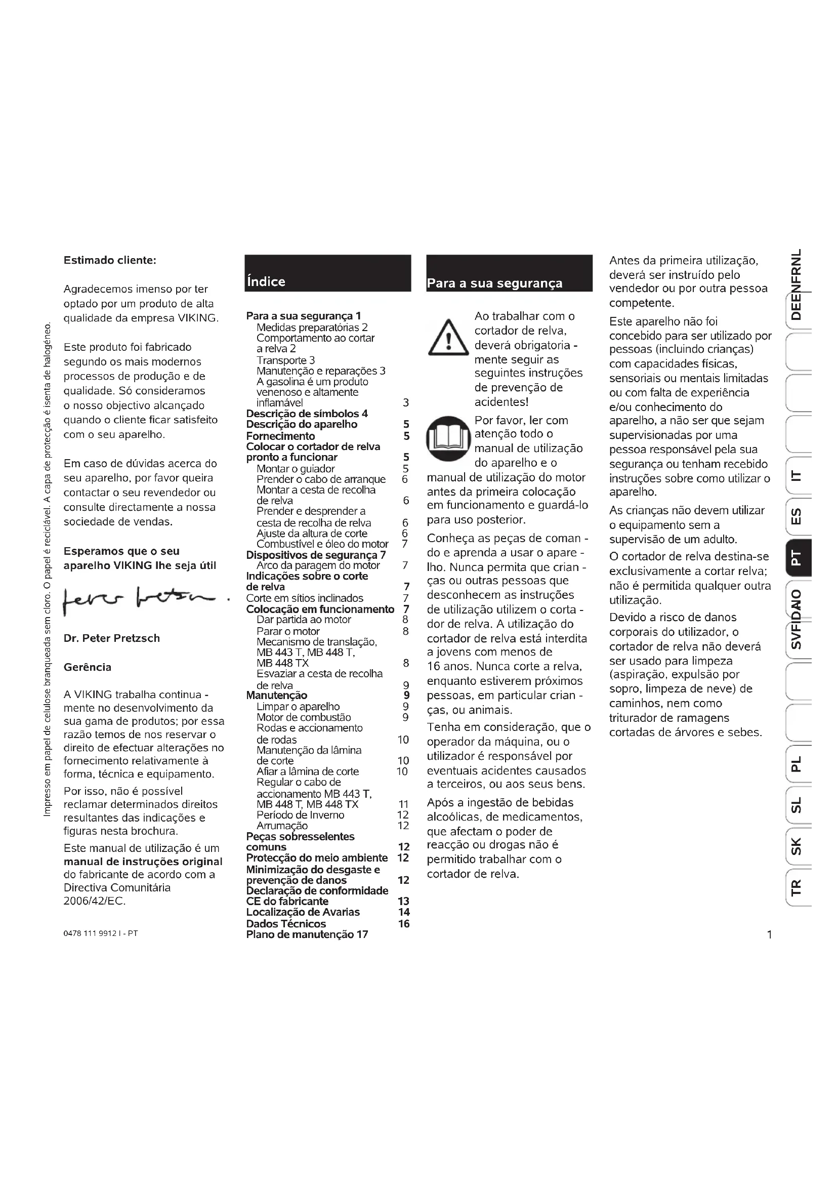 Ao trabalhar com o cortador de relva, deverá obrigatoria - mente seguir as seguintes instruções de prevenção de acidentes! Por favor, ler com atenção todo o manual de utilização do aparelho e o manual de utilização do motor antes da primeira colocação em funcionamento e guardá-lo para uso posterior. Conheça as peças de coman - do e aprenda a usar o apare - lho. Nunca permita que crian - ças ou outras pessoas que desconhecem as instruções de utilização utilizem o corta - dor de relva. A utilização do cortador de relva está interdita a jovens com menos de 16 anos. Nunca corte a relva, enquanto estiverem próximos pessoas, em particular crian - ças, ou animais. Tenha em consideração, que o operador da máquina, ou o utilizador é responsável por eventuais acidentes causados a terceiros, ou aos seus bens. Após a ingestão de bebidas alcoólicas, de medicamentos, que afectam o poder de reacção ou drogas não é permitido trabalhar com o cortador de relva. Estimado cliente: Agradecemos imenso por ter optado por um produto de alta qualidade da empresa VIKING. Este produto foi fabricado segundo os mais modernos processos de produção e de qualidade. Só consideramos o nosso objectivo alcançado quando o cliente ficar satisfeito com o seu aparelho. Em caso de dúvidas acerca do seu aparelho, por favor queira contactar o seu revendedor ou consulte directamente a nossa sociedade de vendas. Esperamos que o seu aparelho VIKING lhe seja útil Dr. Peter Pretzsch Gerência A VIKING trabalha continua - mente no desenvolvimento da sua gama de produtos; por essa razão temos de nos reservar o direito de efectuar alterações no fornecimento relativamente à forma, técnica e equipamento. Por isso, não é possível reclamar determinados direitos resultantes das indicações e figuras nesta brochura. Este manual de utilização é um manual de instruções original do fabricante de acordo com a Directiva Comunitária 2006/42/EC. Índice Para a sua segurança 1 Medidas preparatórias 2 Comportamento ao cortar a relva 2 Transporte 3 Manutenção e reparações 3 A gasolina é um produto venenoso e altamente inflamável 3 Descrição de símbolos 4 Descrição do aparelho 5 Fornecimento 5 Colocar o cortador de relva pronto a funcionar 5 Montar o guiador 5 Prender o cabo de arranque 6 Montar a cesta de recolha de relva 6 Prender e desprender a cesta de recolha de relva 6 Ajuste da altura de corte 6 Combustível e óleo do motor 7 Dispositivos de segurança 7 Arco da paragem do motor 7 Indicações sobre o corte de relva 7 Corte em sítios inclinados 7 Colocação em funcionamento 7 Dar partida ao motor 8 Parar o motor 8 Mecanismo de translação, MB 443 T, MB 448 T, MB 448 TX 8 Esvaziar a cesta de recolha de relva 9 Manutenção 9 Limpar o aparelho 9 Motor de combustão 9 Rodas e accionamento de rodas 10 Manutenção da lâmina de corte 10 Afiar a lâmina de corte 10 Regular o cabo de accionamento MB 443 T, MB 448 T, MB 448 TX 11 Período de Inverno 12 Arrumação 12 Peças sobresselentes comuns 12 Protecção do meio ambiente 12 Minimização do desgaste e prevenção de danos 12 Declaração de conformidade CE do fabricante 13 Localização de Avarias 14 Dados Técnicos 16 Plano de manutenção 17 Para a sua segurança Antes da primeira utilização, deverá ser instruído pelo vendedor ou por outra pessoa competente. Este aparelho não foi concebido para ser utilizado por pessoas (incluindo crianças) com capacidades físicas, sensoriais ou mentais limitadas ou com falta de experiência e/ou conhecimento do aparelho, a não ser que sejam supervisionadas por uma pessoa responsável pela sua segurança ou tenham recebido instruções sobre como utilizar o aparelho. As crianças não devem utilizar o equipamento sem a supervisão de um adulto. O cortador de relva destina-se exclusivamente a cortar relva; não é permitida qualquer outra utilização. Devido a risco de danos corporais do utilizador, o cortador de relva não deverá ser usado para limpeza (aspiração, expulsão por sopro, limpeza de neve) de caminhos, nem como triturador de ramagens cortadas de árvores e sebes. Impresso em papel de celulose branqueada sem cloro. O papel é reciclável. A capa de protecção é isenta de halogéneo.2 0478 111 9912 I - PT