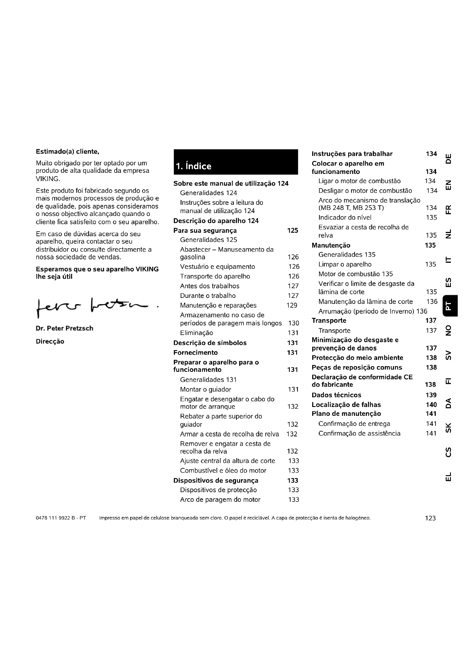 Sobre este manual de utilização 124 Generalidades 124 Instruções sobre a leitura do manual de utilização 124 Descrição do aparelho 124 Para sua segurança 125 Generalidades 125 Abastecer – Manuseamento da gasolina 126 Vestuário e equipamento 126 Transporte do aparelho 126 Antes dos trabalhos 127 Durante o trabalho 127 Manutenção e reparações 129 Armazenamento no caso de períodos de paragem mais longos 130 Eliminação 131 Descrição de símbolos 131 Fornecimento 131 Preparar o aparelho para o funcionamento 131 Generalidades 131 Montar o guiador 131 Engatar e desengatar o cabo do motor de arranque 132 Rebater a parte superior do guiador 132 Armar a cesta de recolha de relva 132 Remover e engatar a cesta de recolha da relva 132 Ajuste central da altura de corte 133 Combustível e óleo do motor 133 Dispositivos de segurança 133 Dispositivos de protecção 133 Arco de paragem do motor 133 Instruções para trabalhar 134 Colocar o aparelho em funcionamento 134 Ligar o motor de combustão 134 Desligar o motor de combustão 134 Arco do mecanismo de translação (MB 248 T, MB 253 T) 134 Indicador do nível 135 Esvaziar a cesta de recolha de relva 135 Manutenção 135 Generalidades 135 Limpar o aparelho 135 Motor de combustão 135 Verificar o limite de desgaste da lâmina de corte 135 Manutenção da lâmina de corte 136 Arrumação (período de Inverno) 136 Transporte 137 Transporte 137 Minimização do desgaste e prevenção de danos 137 Protecção do meio ambiente 138 Peças de reposição comuns 138 Declaração de conformidade CE do fabricante 138 Dados técnicos 139 Localização de falhas 140 Plano de manutenção 141 Confirmação de entrega 141 Confirmação de assistência 1410478 111 9922 B - PT