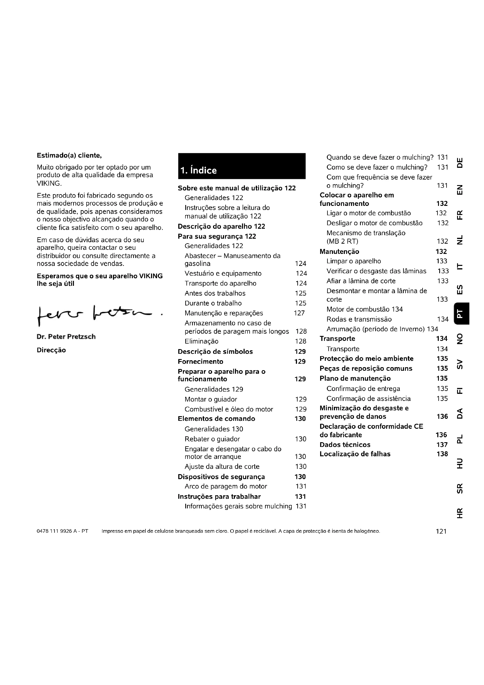Os lixos como o óleo antigo ou o combustível, lubrificante, filtros e baterias usados e peças de desgaste semelhantes podem prejudicar os seres humanos, os animais e o meio-ambiente e, como tal, têm de ser devidamente eliminados. Dirija-se ao seu centro de reciclagem ou ao seu distribuidor oficial para ficar a saber como os lixos devem ser removidos adequadamente. A VIKING recomenda o distribuidor oficial VIKING. Certifique-se de que um aparelho já desactivado é encaminhado para ser eliminado de maneira tecnicamente correcta. Antes de proceder à eliminação, inutilize o aparelho. No sentido de evitar acidentes, retire nomeadamente o cabo de ignição, esvazie o depósito e escoe o óleo do motor. Perigo de ferimentos na lâmina de corte! Nunca deixe um cortador de relva desactivado sem alguém a vigiar. Certifique-se de que o aparelho e, em particular, a lâmina de corte são guardados fora do alcance das crianças.129 DEENFRNLITESNOSVFIDAPLHUSRHR PT 0478 111 9926 A - PT MB 2 RT: