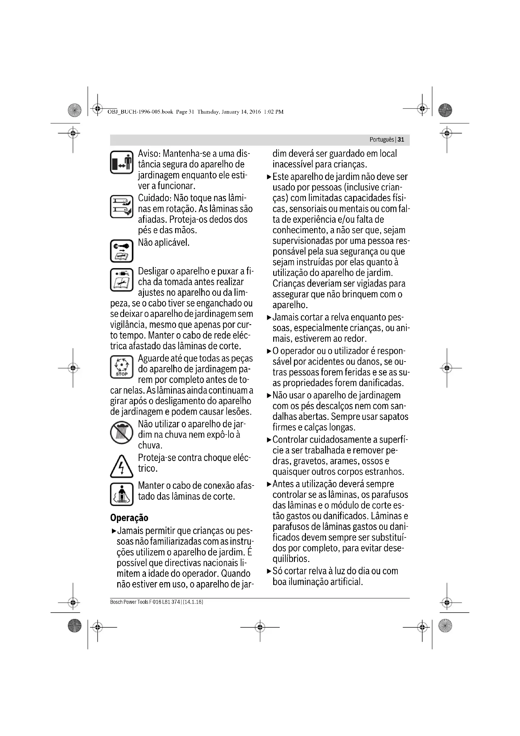Objetivo Figura Página STOP Síntomas Posible causa Solución El motor no funciona No hay tensión de red Verificar y conectar Toma de corriente defectuosa Emplear otra toma de corriente Cable de prolongación defectuoso Verificar y sustituir el cable, si procede El fusible se ha fundido Cambiar el fusible Césped demasiado alto Ajustar una altura de corte mayor e inclinar ha- cia arriba la parte delantera del aparato para jardín al iniciar el corte, para reducir la carga El guardamotor se ha activado Dejar que se enfríe el motor y ajustar una altura de corte mayor El aparato para jardín funciona de forma intermitente Cable de prolongación defectuoso Verificar y sustituir el cable, si procede Cableado interior de la máquina defectuoso Acudir al servicio técnico El guardamotor se ha activado Dejar que se enfríe el motor y ajustar una altura de corte mayor El corte del césped es irregular y/o el motor trabaja con dificultad Altura de corte muy baja Ajustar una altura de corte mayor Cuchilla mellada Cambiar cuchilla Puede que exista una obstrucción Examine la parte inferior del aparato para jar- dín y desobstrúyala, si procede (utilice siem- pre unos guantes de protección) Cuchilla montada al revés Montar la cuchilla en la posición correcta Al conectar el aparato para jar- dín, la cuchilla de corte no gira Cuchilla obstaculizada por la hierba Desconectar el aparato para jardín Desobstruirlo (utilice siempre unos guantes de protección) Tuerca/tornillo de sujeción de la cuchilla flojos Apretar la tuerca/tornillo de sujeción de la cu- chilla (17 Nm) Vibraciones o ruidos intensos Tuerca/tornillo de sujeción de la cuchilla flojos Apretar la tuerca/tornillo de sujeción de la cu- chilla (17 Nm) Cuchilla dañada Cambiar cuchilla OBJ_BUCH-1996-005.book Page 29 Thursday, January 14, 2016 1:02 PM30 | Português F 016 L81 374 | (14.1.16) Bosch Power Tools Servicio técnico y atención al cliente www.bosch-garden.com Para cualquier consulta o pedido de piezas de repuesto es im- prescindible indicar el nº de artículo de 10 dígitos que figura en la placa de características del aparato para jardín. España Robert Bosch España S.L.U. Departamento de ventas Herramientas Eléctricas C/Hermanos García Noblejas, 19 28037 Madrid Para efectuar su pedido online de recambios o pedir la recogi- da para la reparación de su máquina, entre en la página www.herramientasbosch.net. Tel. Asesoramiento al cliente: 902 531 553 Fax: 902 531554 Venezuela Robert Bosch S.A. Final Calle Vargas. Edf. Centro Berimer P.B. Boleita Norte Caracas 107 Tel.: (0212) 2074511 México Robert Bosch S. de R.L. de C.V. Calle Robert Bosch No. 405 C.P. 50071 Zona Industrial, Toluca - Estado de México Tel. Interior: (01) 800 6271286 Tel. D.F.: 52843062 E-Mail: arturo.fernandez@mx.bosch.com Argentina Robert Bosch Argentina S.A. Av. Córdoba 5160 C1414BAW Ciudad Autónoma de Buenos Aires Atención al Cliente Tel.: (0810) 5552020 E-Mail: herramientas.bosch@ar.bosch.com Perú Robert Bosch S.A.C. Av. Primavera 781, Urb. Chacarilla, San Borja (Edificio Aldo) Buzón Postal Lima 41 - Lima Tel.: (01) 2190332 Chile Robert Bosch S.A. Calle El Cacique 0258 Providencia – Santiago Tel.: (02) 2405 5500 Ecuador Robert Bosch Sociedad Anonima Ecuabosch Av. Las Monjas nº 10 y Carlos J. Arosamena Guayaquil – Ecuador Tel. (04) 220 4000 Email: atencion.cliente@ec.bosch.com Eliminación Los aparatos para jardín, accesorios y embalajes deberán so- meterse a un proceso de recuperación que respete el medio ambiente. ¡No arroje los aparatos para jardín a la basura! Sólo para los países de la UE: Conforme a la Directiva Europea 2012/19/UE sobre aparatos eléctricos y electrónicos inservibles, tras su transposi- ción en ley nacional, deberán acumularse por separado los aparatos eléctricos y elec- trónicos para ser sometidos a un reciclaje ecológico. Reservado el derecho de modificación. El símbolo es solamente válido, si también se encuentra sobre la placa de características del producto/fabricado. Português Indicações de segurança Atenção! Leia atentamente as se- guintes instruções. Familiarize-se com os elementos de comando e com a utilização do aparelho de jardina- gem. Guarde as instruções de servi- ço em lugar seguro para uma utiliza- ção posterior. Explicação dos símbolos no aparelho de jardinagem Indicação geral de perigos. Leia atentamente estas instru- ções de serviço. Observe que as pessoas ao re- dor não possam ser feridas por objectos catapultados para lon- ge. OBJ_BUCH-1996-005.book Page 30 Thursday, January 14, 2016 1:02 PMPortuguês | 31 Bosch Power Tools F 016 L81 374 | (14.1.16) Aviso: Mantenha-se a uma dis- tância segura do aparelho de jardinagem enquanto ele esti- ver a funcionar. Cuidado: Não toque nas lâmi- nas em rotação. As lâminas são afiadas. Proteja-os dedos dos pés e das mãos. Não aplicável. Desligar o aparelho e puxar a fi- cha da tomada antes realizar ajustes no aparelho ou da lim- peza, se o cabo tiver se enganchado ou se deixar o aparelho de jardinagem sem vigilância, mesmo que apenas por cur- to tempo. Manter o cabo de rede eléc- trica afastado das lâminas de corte. Aguarde até que todas as peças do aparelho de jardinagem pa- rem por completo antes de to- car nelas. As lâminas ainda continuam a girar após o desligamento do aparelho de jardinagem e podem causar lesões. Não utilizar o aparelho de jar- dim na chuva nem expô-lo à chuva. Proteja-se contra choque eléc- trico. Manter o cabo de conexão afas- tado das lâminas de corte. Operação Jamais permitir que crianças ou pes- soas não familiarizadas com as instru- ções utilizem o aparelho de jardim. É possível que directivas nacionais li- mitem a idade do operador. Quando não estiver em uso, o aparelho de jar- dim deverá ser guardado em local inacessível para crianças. Este aparelho de jardim não deve ser usado por pessoas (inclusive crian- ças) com limitadas capacidades físi- cas