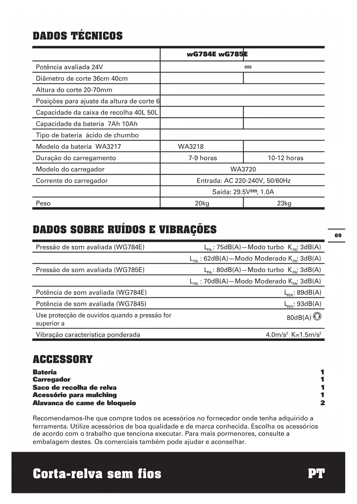 wG784E wG785E Potência avaliada 24V Diâmetro de corte 36cm 40cm Altura do corte 20-70mm Posições para ajuste da altura de corte 6 Capacidade da caixa de recolha 40L 50L Capacidade da bateria 7Ah 10Ah Tipo de bateria ácido de chumbo Modelo da bateria WA3217 WA3218 Duração do carregamento 7-9 horas 10-12 horas Modelo do carregador WA3720 Corrente do carregador Entrada: AC 220-240V, 50/60Hz Saída: 29.5V , 1.0A Peso 20kg 23kg DADOS SOBRE RUÍDOS E VIBRAÇÕES Pressão de som avaliada (WG784E) L