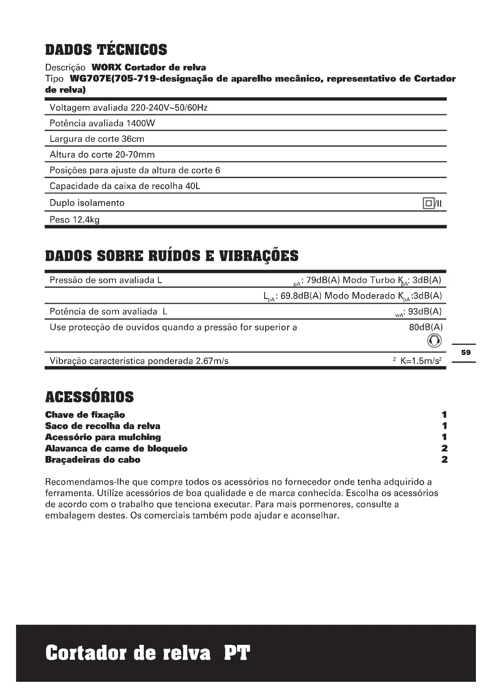 Descrição WORX Cortador de relva Tipo WG707E(705-719-designação de aparelho mecânico, representativo de Cortador de relva) Voltagem avaliada 220-240V~50/60Hz Potência avaliada 1400W Largura de corte 36cm Altura do corte 20-70mm Posições para ajuste da altura de corte 6 Capacidade da caixa de recolha 40L Duplo isolamento /II Peso 12.4kg DADOS SOBRE RUÍDOS E VIBRAÇÕES Pressão de som avaliada L