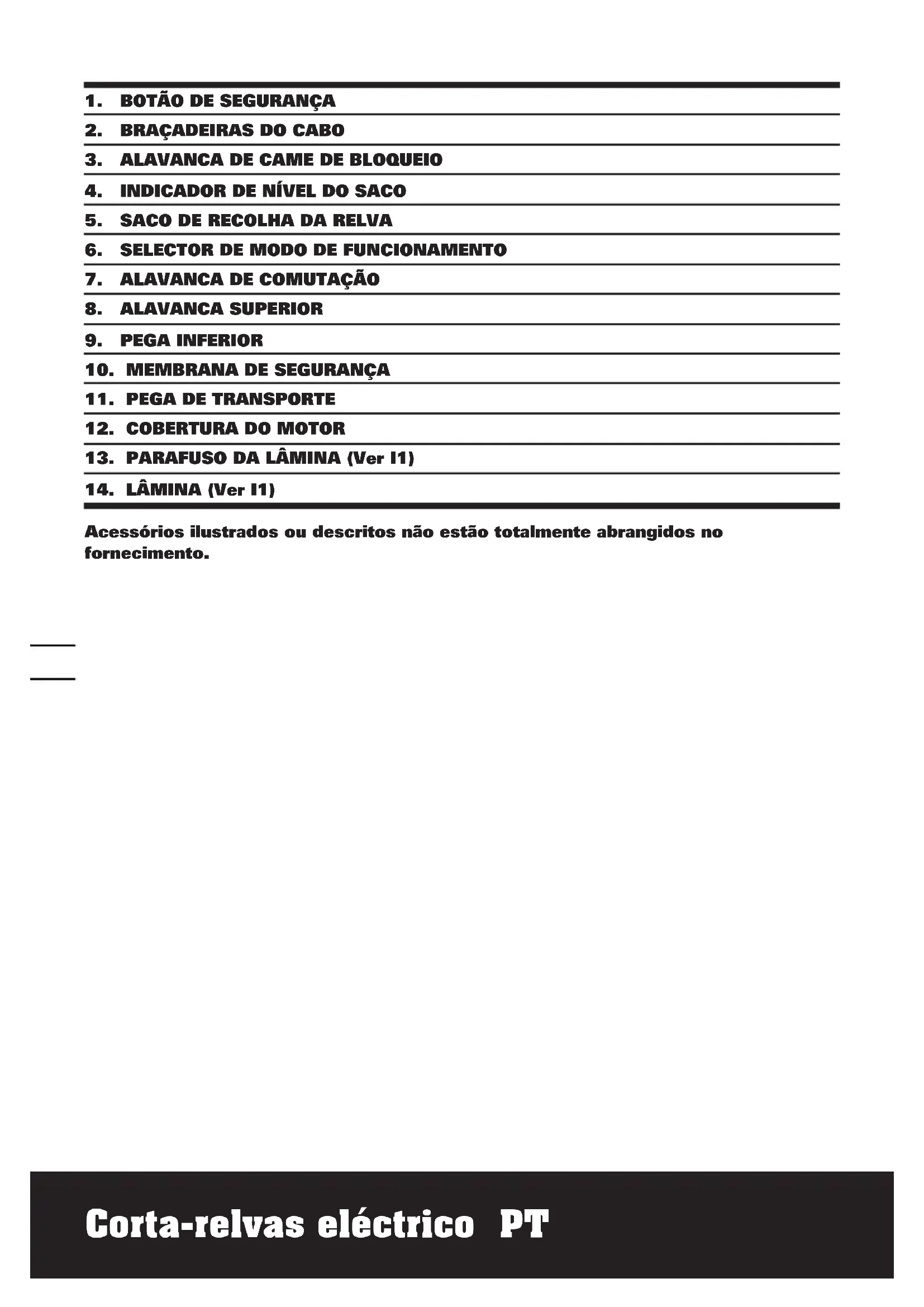 Este produto é concebido para o corte de relva doméstico. MONTAGEM IMPORTANTE! Antes de montar o cortador de grama, confira os acessórios de acordo com as informações acima, certifique-se os acessórios estão concluídas.