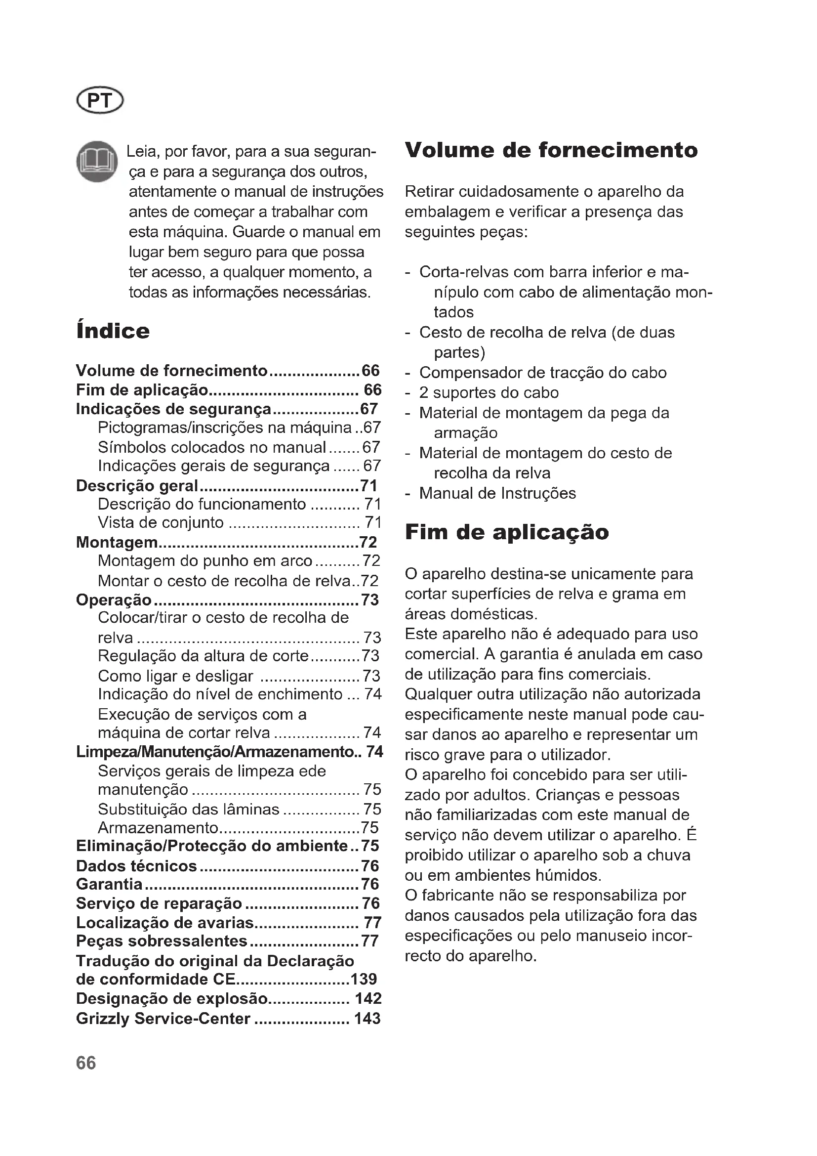 - Grizzly Service-Center Volume de fornecimento Retirar cuidadosamente o aparelho da embalagem e vericar a presença das seguintes peças: - Corta-relvas com barra inferior e ma- nípulo com cabo de alimentação mon- tados - Cesto de recolha de relva (de duas partes) - Compensador de tracção do cabo - 2 suportes do cabo - Material de montagem da pega da armação - Material de montagem do cesto de recolha da relva - Manual de Instruções Fim de aplicação O aparelho destina-se unicamente para cortar superfícies de relva e grama em áreas domésticas. Este aparelho não é adequado para uso comercial. A garantia é anulada em caso de utilização para ns comerciais. Qualquer outra utilização não autorizada especicamente neste manual pode cau- sar danos ao aparelho e representar um risco grave para o utilizador. O aparelho foi concebido para ser utili- zado por adultos. Crianças e pessoas não familiarizadas com este manual de serviço não devem utilizar o aparelho. É proibido utilizar o aparelho sob a chuva ou em ambientes húmidos. O fabricante não se responsabiliza por danos causados pela utilização fora das especicações ou pelo manuseio incor- recto do aparelho. Leia, por favor, para a sua seguran- ça e para a segurança dos outros, atentamente o manual de instruções antes de começar a trabalhar com esta máquina. Guarde o manual em lugar bem seguro para que possa ter acesso, a qualquer momento, a todas as informações necessárias.PT p. 143