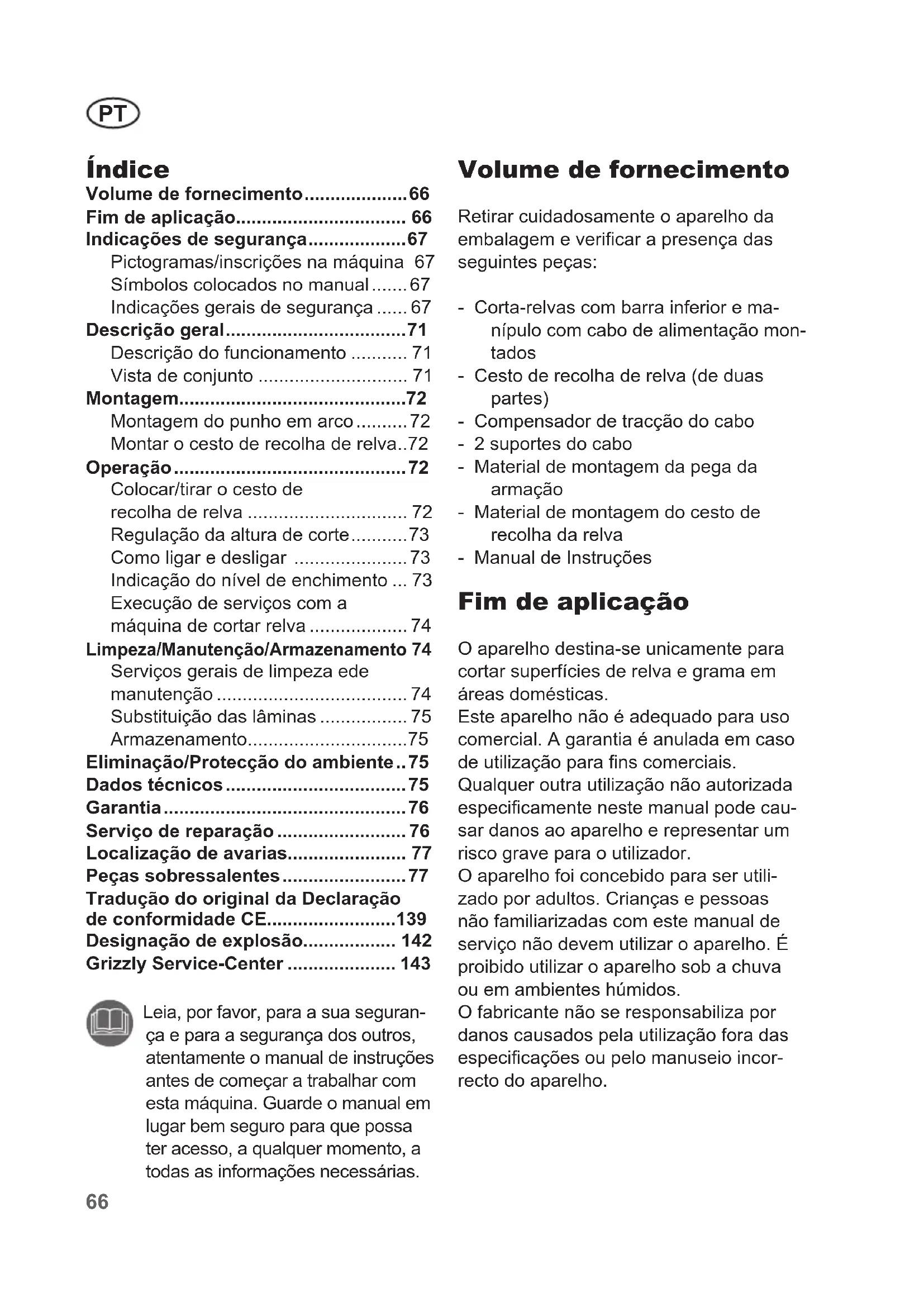 - Grizzly Service-Center Volume de fornecimento Retirar cuidadosamente o aparelho da embalagem e vericar a presença das seguintes peças: - Corta-relvas com barra inferior e ma- nípulo com cabo de alimentação mon- tados - Cesto de recolha de relva (de duas partes) - Compensador de tracção do cabo - 2 suportes do cabo - Material de montagem da pega da armação - Material de montagem do cesto de recolha da relva - Manual de Instruções Fim de aplicação O aparelho destina-se unicamente para cortar superfícies de relva e grama em áreas domésticas. Este aparelho não é adequado para uso comercial. A garantia é anulada em caso de utilização para ns comerciais. Qualquer outra utilização não autorizada especicamente neste manual pode cau- sar danos ao aparelho e representar um risco grave para o utilizador. O aparelho foi concebido para ser utili- zado por adultos. Crianças e pessoas não familiarizadas com este manual de serviço não devem utilizar o aparelho. É proibido utilizar o aparelho sob a chuva ou em ambientes húmidos. O fabricante não se responsabiliza por danos causados pela utilização fora das especicações ou pelo manuseio incor- recto do aparelho. Leia, por favor, para a sua seguran- ça e para a segurança dos outros, atentamente o manual de instruções antes de começar a trabalhar com esta máquina. Guarde o manual em lugar bem seguro para que possa ter acesso, a qualquer momento, a todas as informações necessárias.PT p. 143