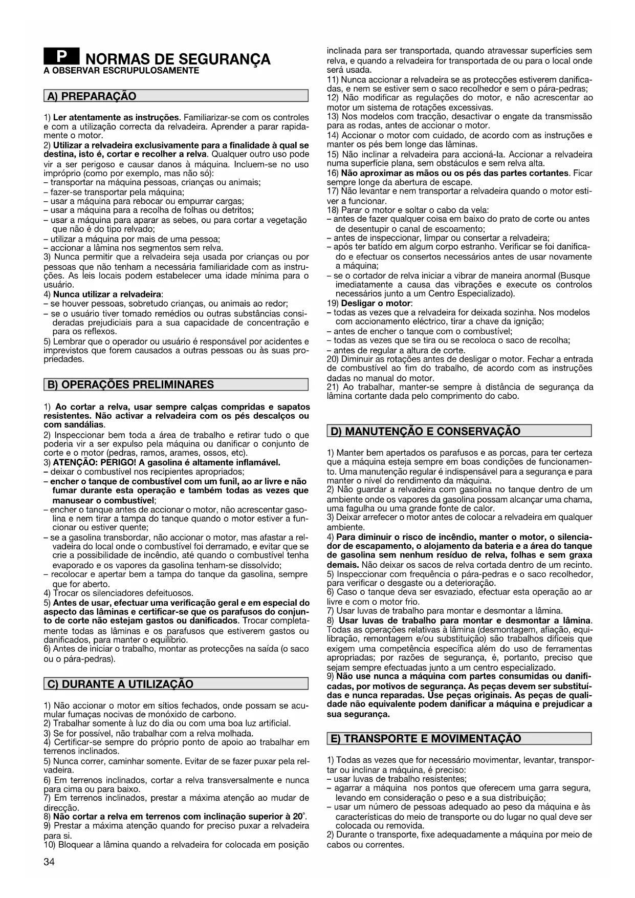 pada para “mulching” devem ser feitos segundo as nor- mas de segurança previstas no manual de instruções da máquina e informações dadas para as diversas situa- ções de uso e manutenção. B) Normas de uso