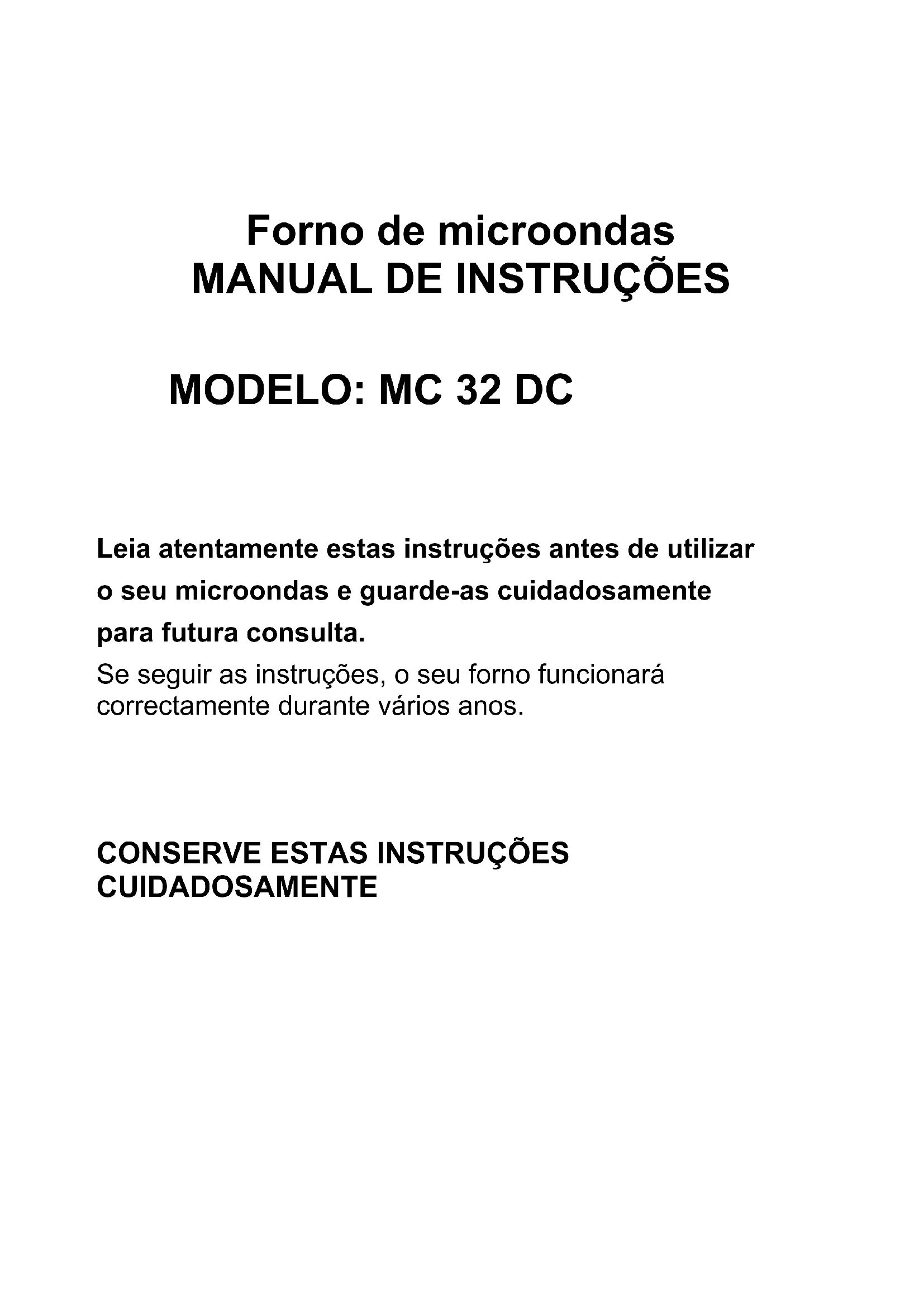 De acordo com a directiva da Eliminação de Equipamento Eléctrico e Electrónico (WEEE), estes aparelhos devem ser separados do lixo comum e tratados. Se no futuro precisar de eliminar este produto, NÃO o coloque no lixo doméstico comum. Envie o produto para um ponto de recolha de WEEE, quando disponível.SAVE THESE INSTRUCTIONS CAREFULLY Read these instructions carefully before using your microwave oven, and keep it carefully. If you follow the instructions, your oven will provide you with many years of good service. MODEL:MC 32 DCPRECAUTIONS TO AVOID POSSIBLE EXPOSURE