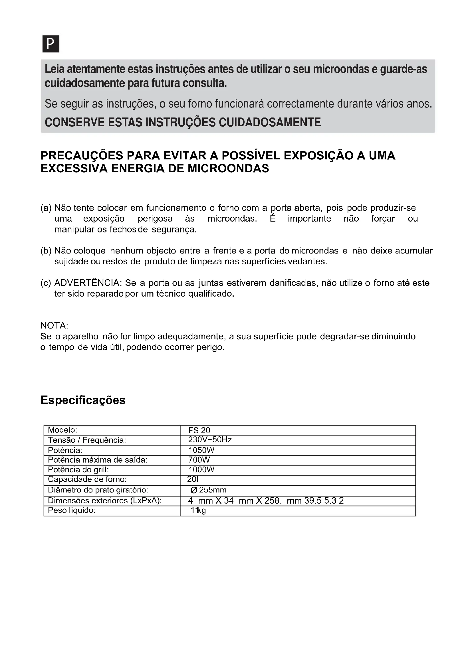 FS 20INSTRUÇÕES DE SEGURANÇA IMPORTANTES AVISO Para reduzir o risco de incêndio, choque eléctri- co, lesão ou exposição a energia excessiva do forno de microondas ao utilizar o seu aparelho, siga as seguintes precauções básicas: